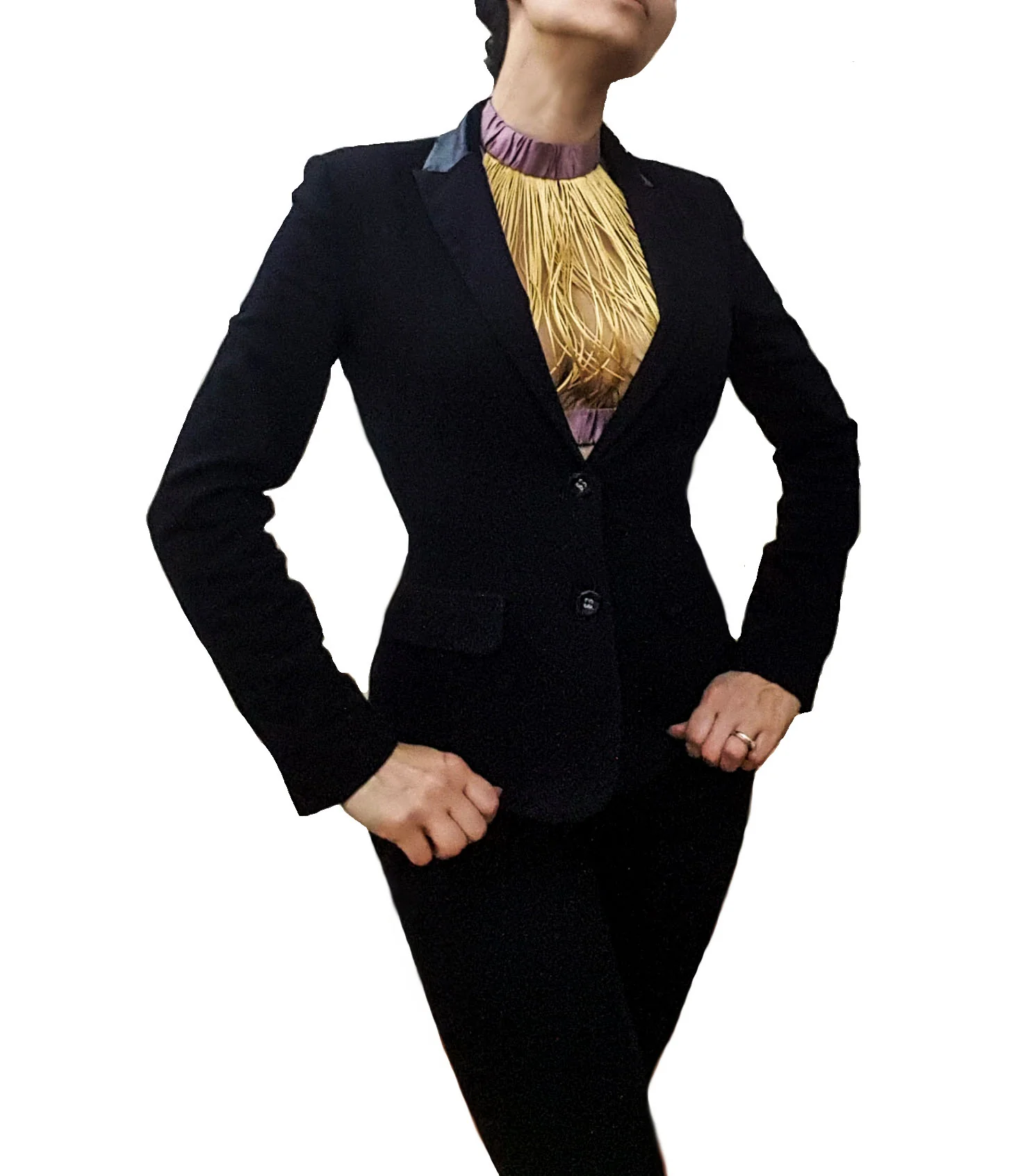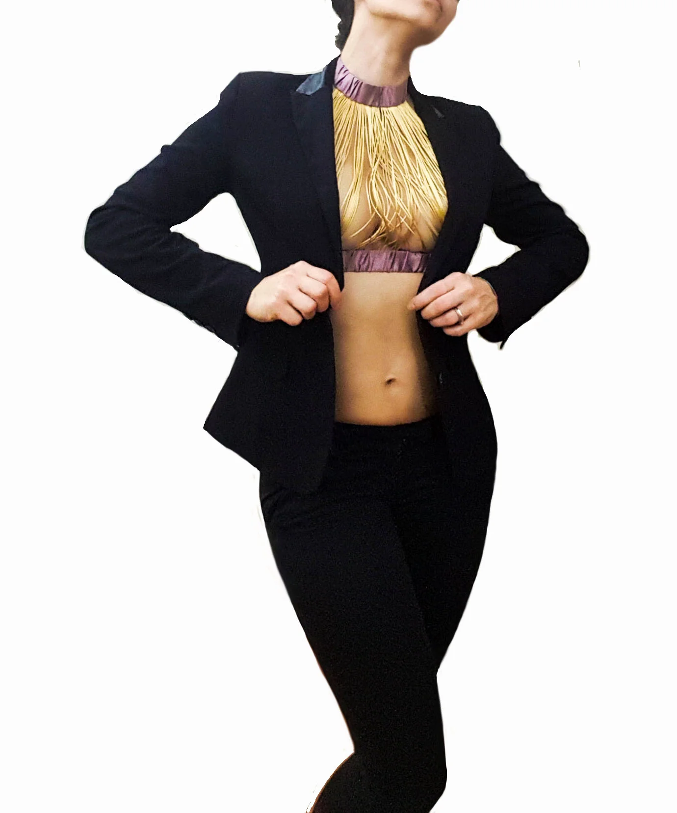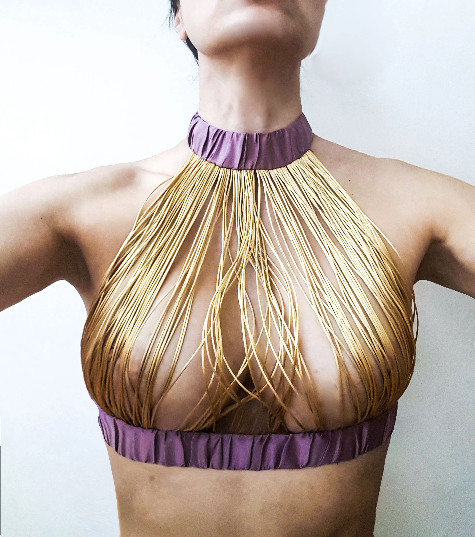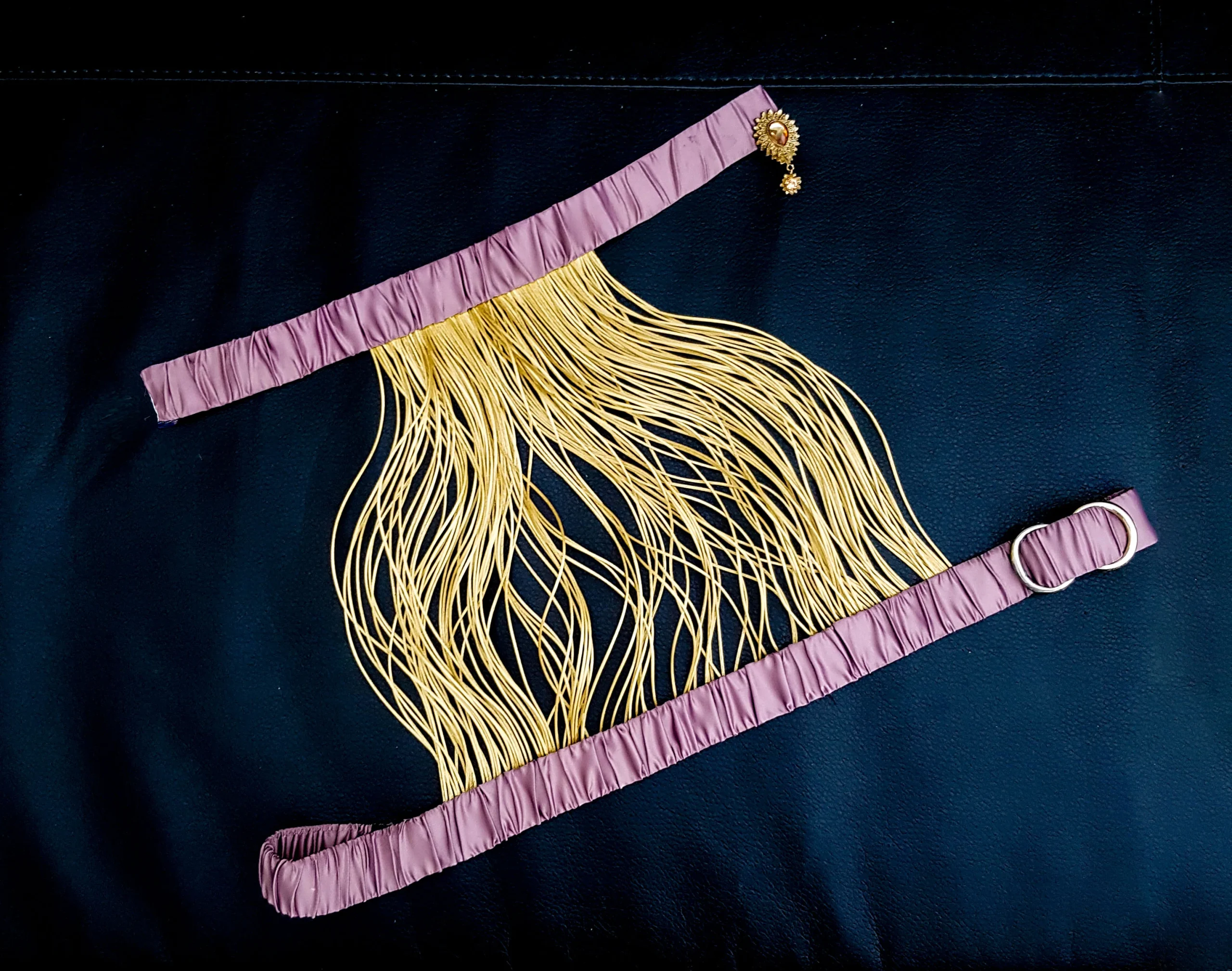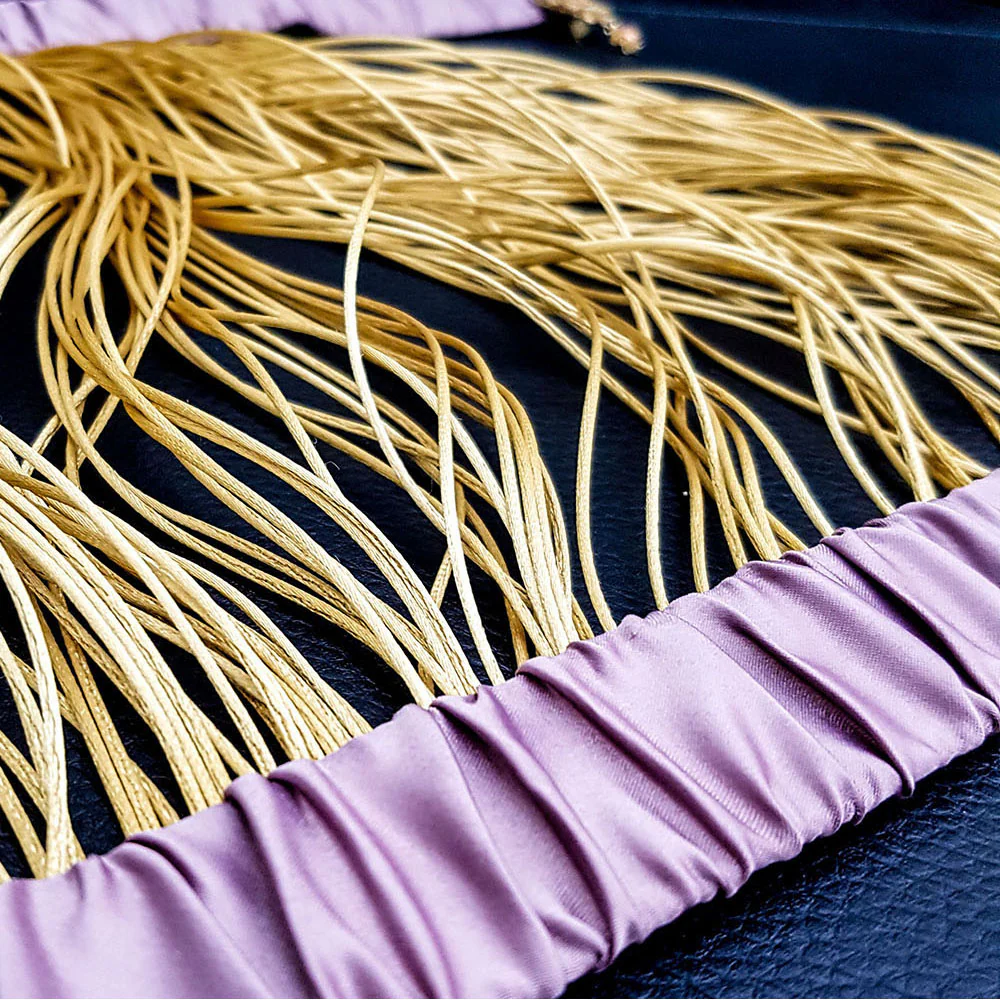 Inatteso binomio di colori che sfrutta la lucentezza del satin per liberare tutte le sfumature che nascono dal motivo a drappeggio e dalle frange in raso tubolare golden.