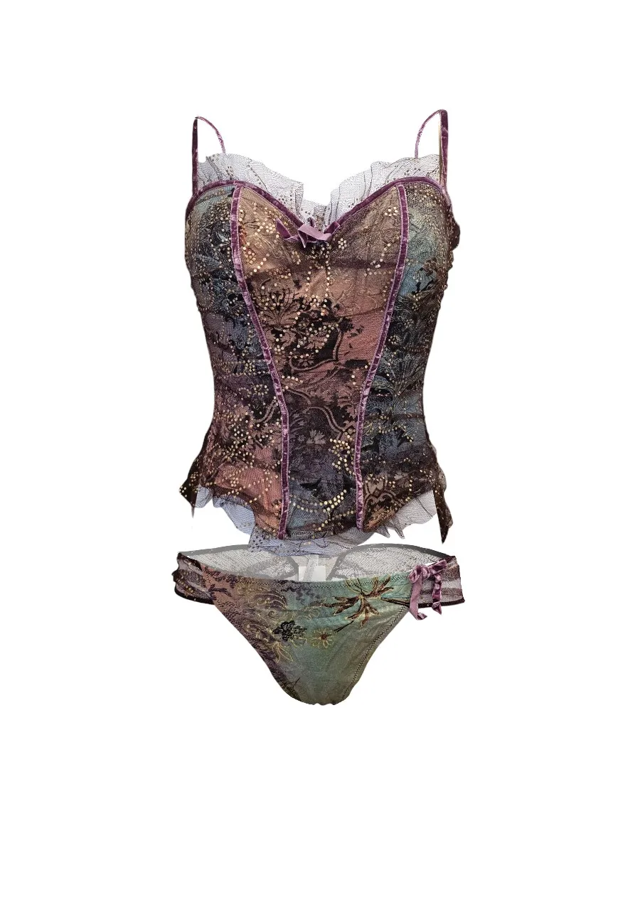 Bustier fantasia 4ยฐ preformato con ferretto. Perizoma coordinato. Fantasia fullprint con rifiniture in tulle e dettagli in velluto.