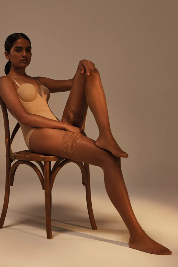 Media 15 DEN. Con reggicalze in pizzo e due fasce in silicone per un sostegno totale.