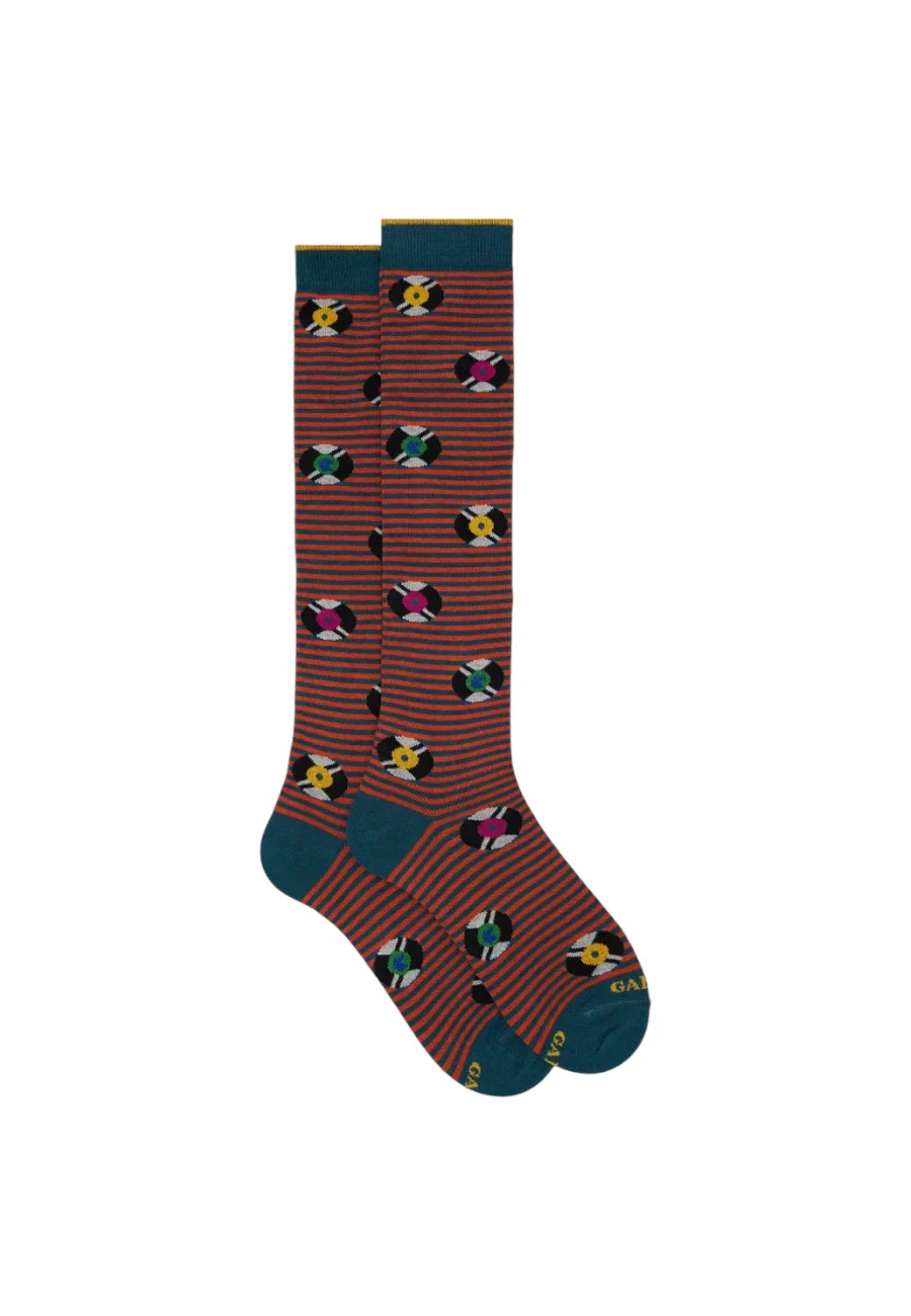 Calze lunghe da uomo in cotone verde, decorate con una vivace fantasia di dischi in vinile. Perfette per aggiungere un tocco vintage e originale al tuo stile.