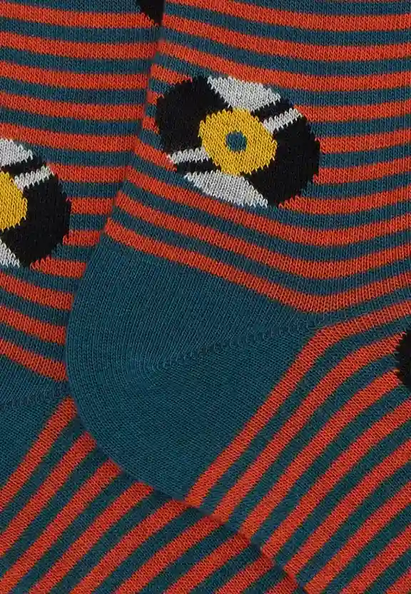 Calze lunghe da uomo in cotone verde, decorate con una vivace fantasia di dischi in vinile. Perfette per aggiungere un tocco vintage e originale al tuo stile.Made in Italy 83% Cotone 15% Poliammide 2% Elastan
