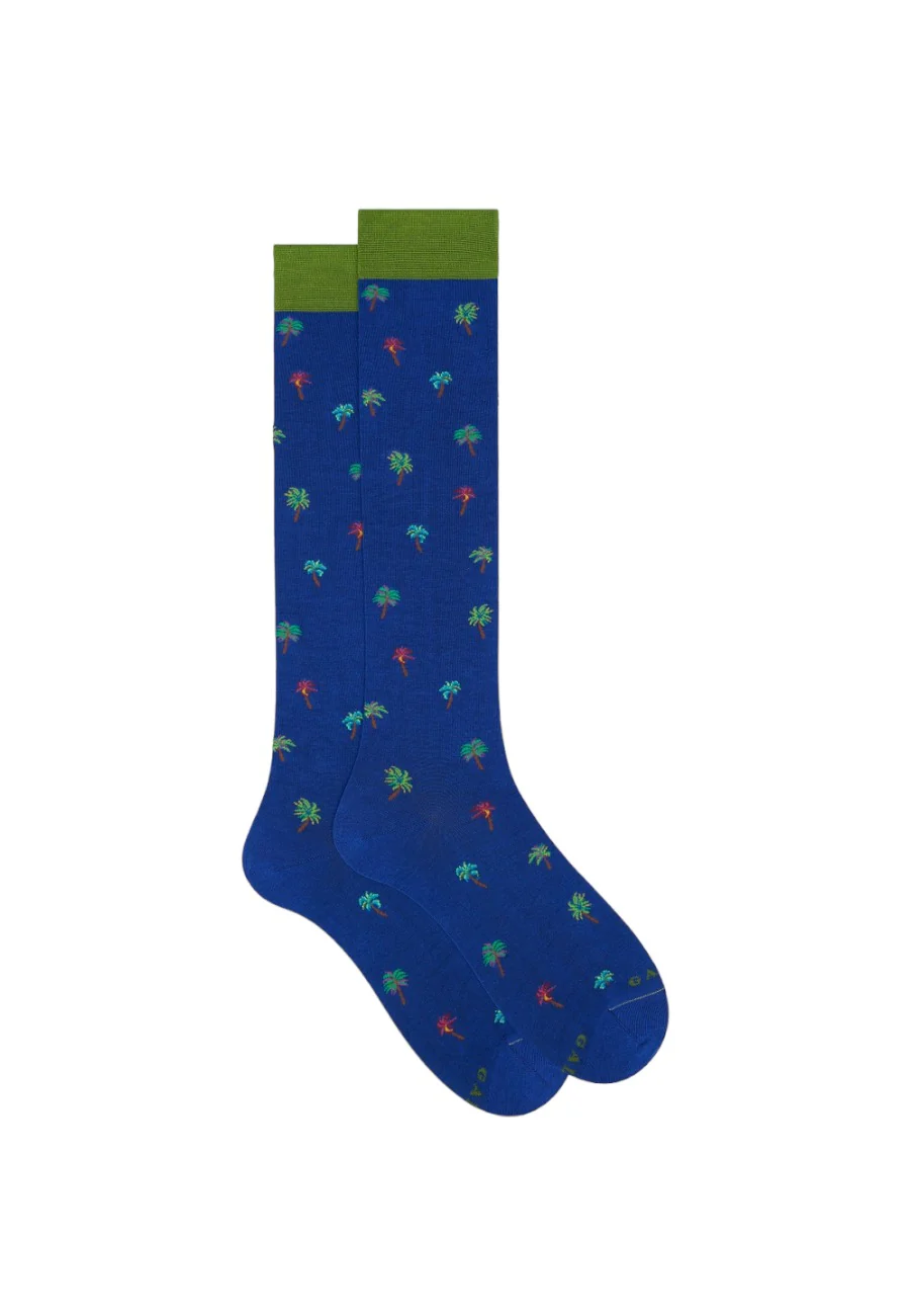 Calze da uomo realizzate in Italia in cotone leggerissimo. Tinta unita blu cobalto con piccole palme ricamate a contrasto. Fascetta di diverso colore. Si abbinano ad ogni stile e possono essere indossate sia con una scarpa casual che elegante.
