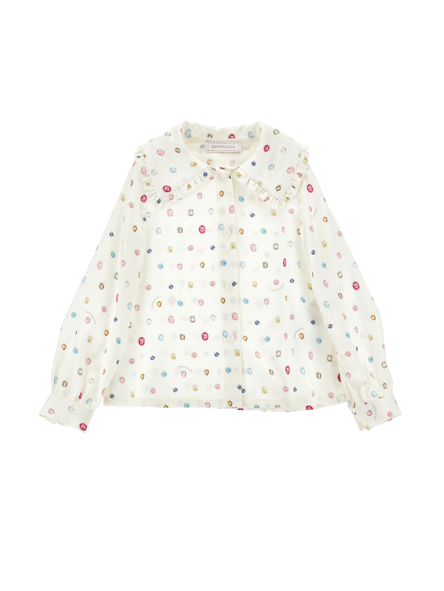 Camicia elegante Monnalisa. per bambine e ragazze, il prodotto presenta un colore bianco crema, bottoni frontali, dettagli ricamati con fantasia di gioelli multicolore, colletto con ruches, maniche lunghe, polsini con bottone.