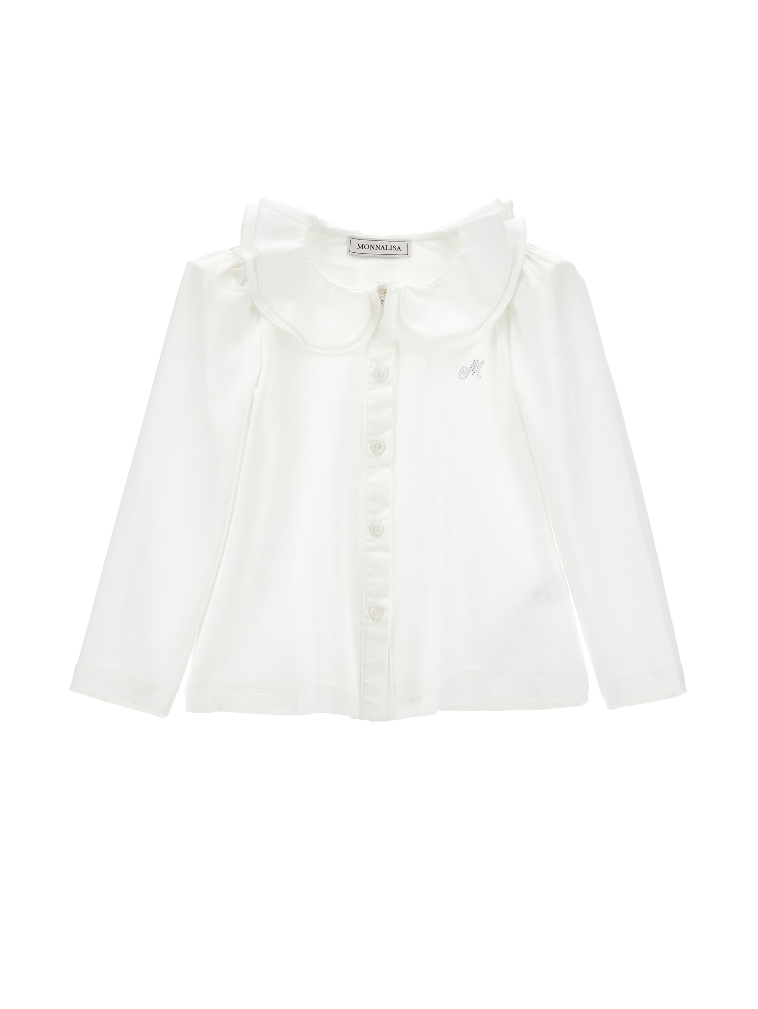 Camicia per bambina Monnalisa, realizzata in cotone 93%, elastam 7%. Il prodotto presenta un colore bianco, colletto arricciato, maniche lunghe, chiusura con bottoni, dettagli ricamati, orlo dritto.