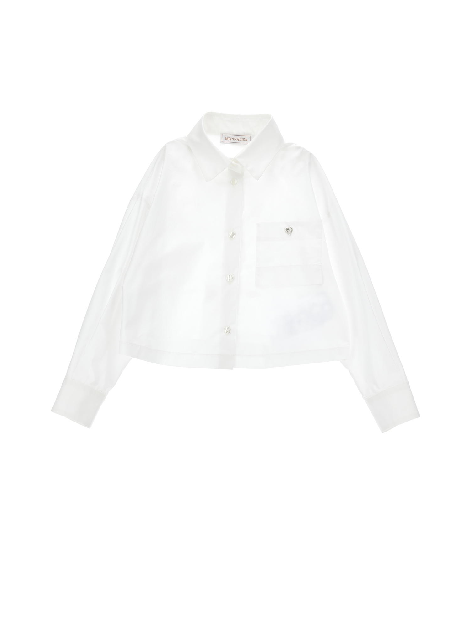 Camicia in popeline elegante Monnalisa. per bambine e ragazze, il prodotto presenta un colore bianco, bottoni frontali, tasca frontale con dettaglio cuore, colletto classico e polsini con bottoni, ricamo monogramma “M” sul retro.