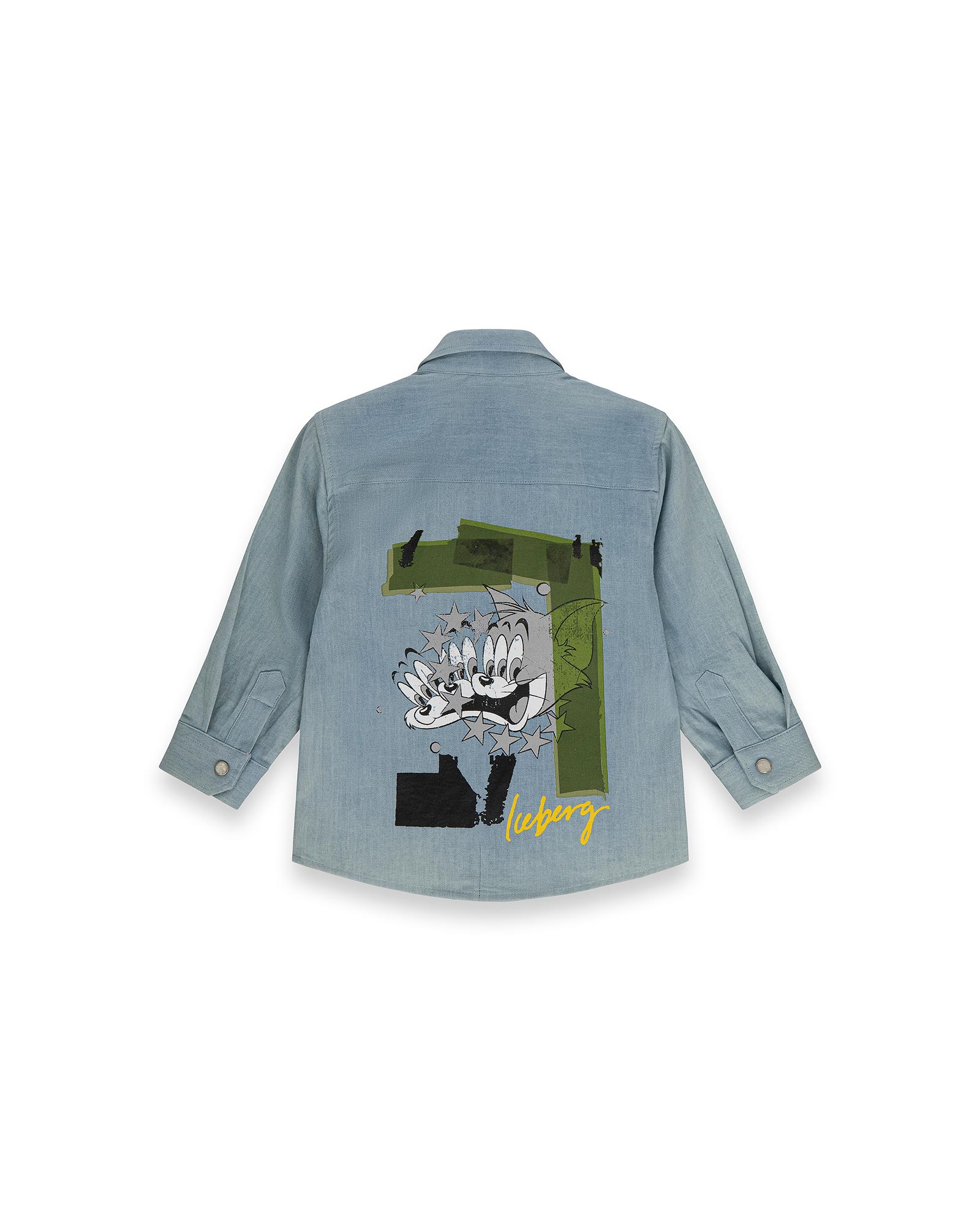 Camicia in denim leggero con micro ricamo del logo sul petto e abbottonatura a pressione. Taglio dritto e polsini regolabili, stampa iconica sul retro. Si indossa come camicia o overshirt.
