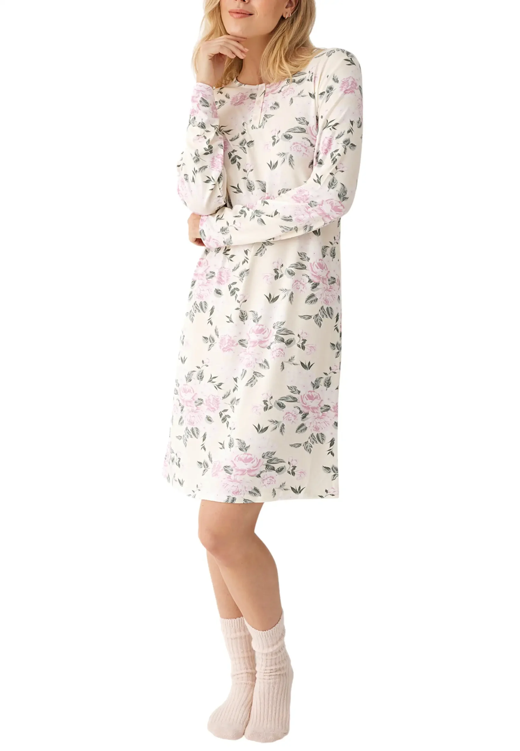 Camicia da notte Promise, maniche lunghe, chiusura 3 bottoni e tasche laterali. Realizzata in viscosa molto morbida e piacevole al tatto, con una graziosa stampa floreale.