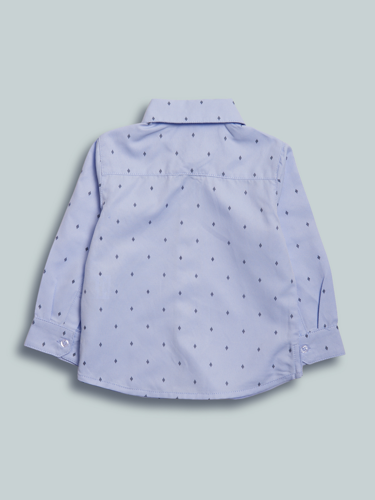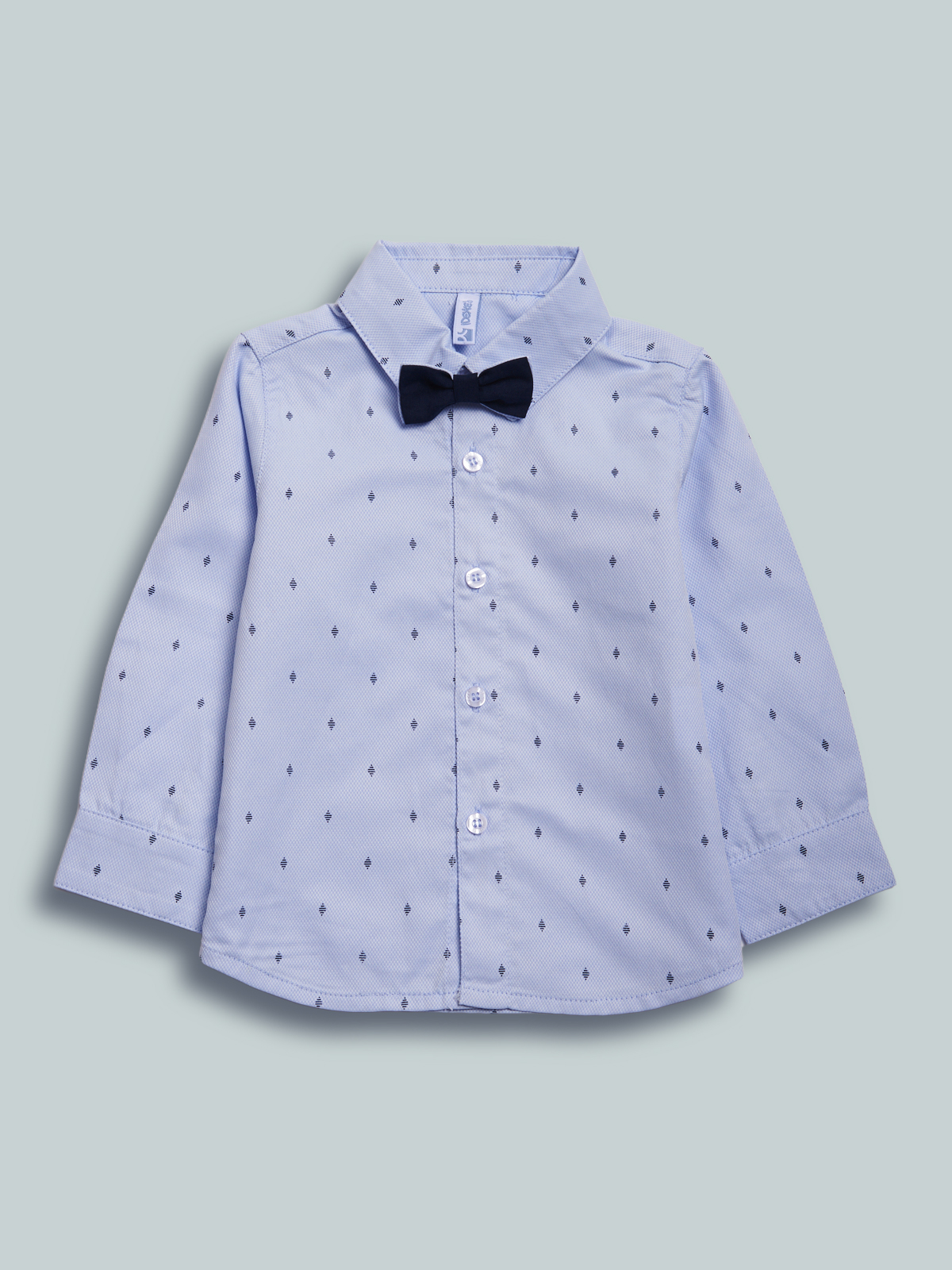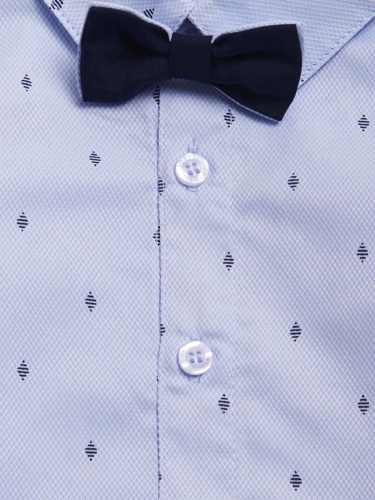 Camicia a manica lunga in cotone operato microfantasia. Apertura davanti e polsini con bottoni madreperla, pratico papillon regolabile e removibile. Il capo ideale per le occasioni speciali.