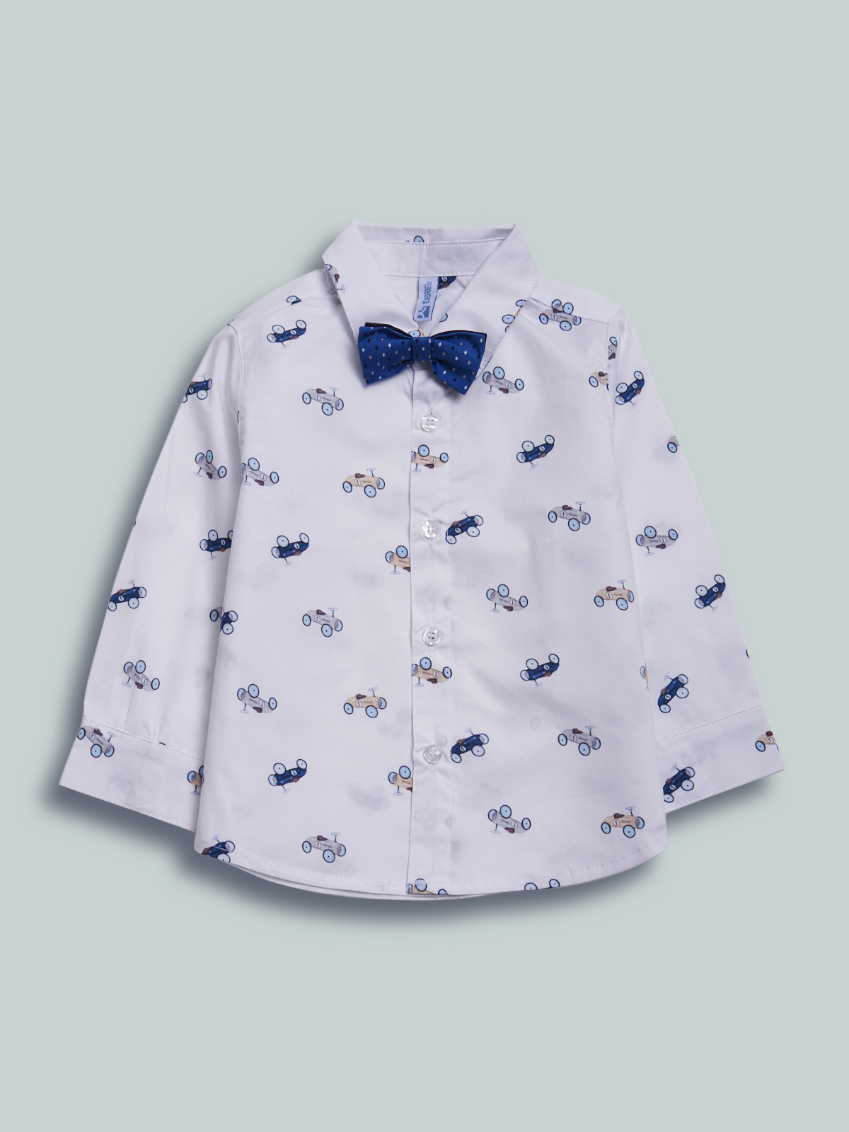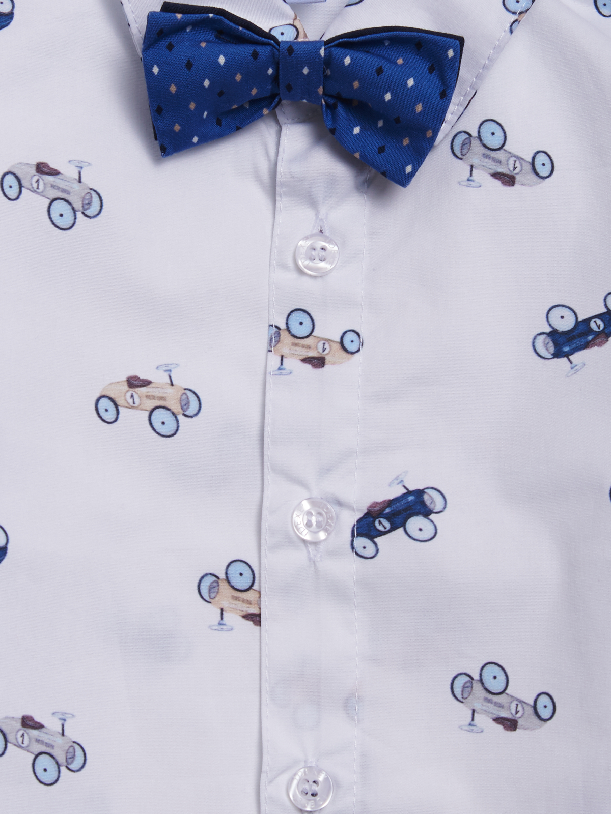 Camicia elegante a manica lunga in cotone elasticizzato fantasia. Apertura davanti e polsini con bottoni madreperla, pratico papillon regolabile e removibile. Il capo ideale per le occasioni speciali.