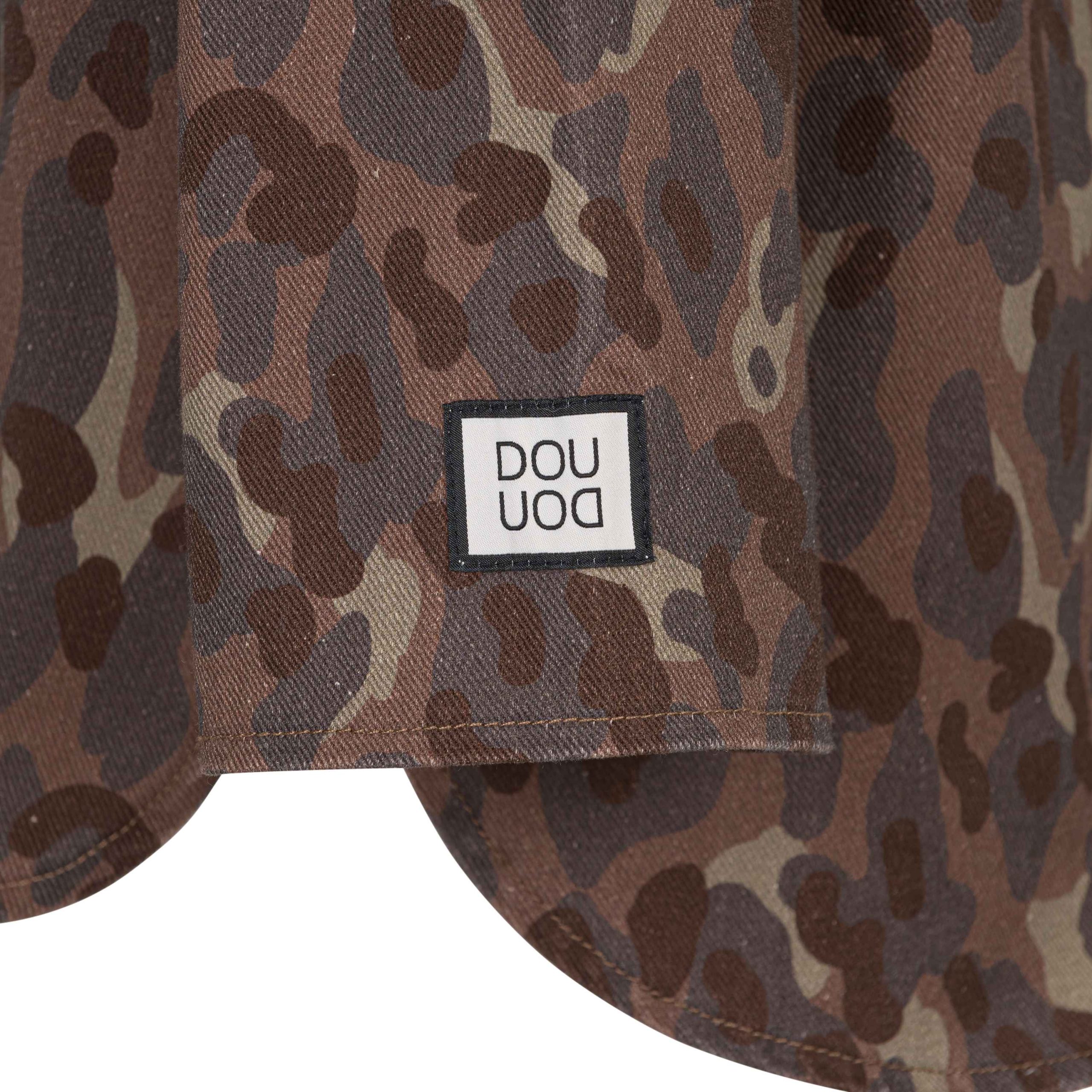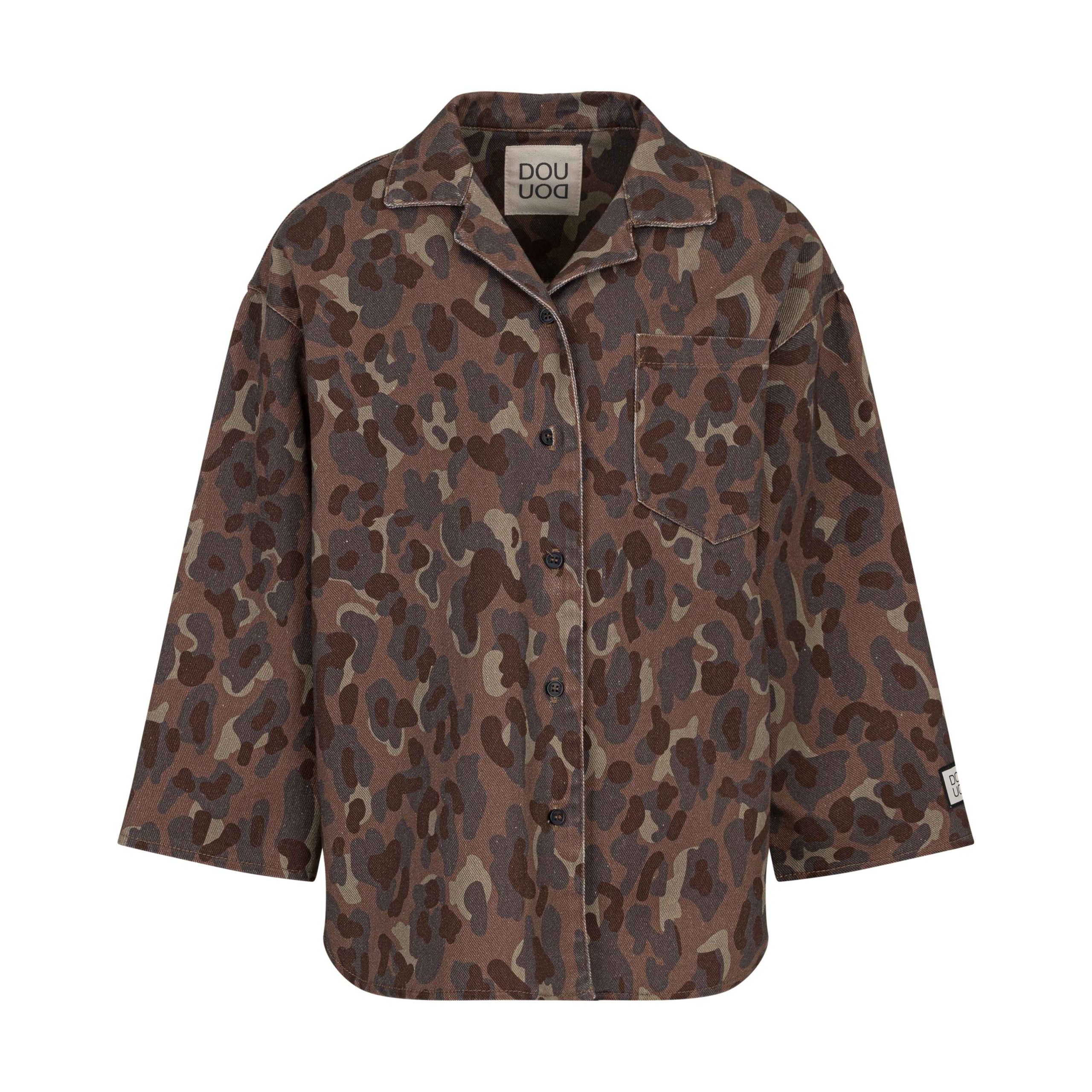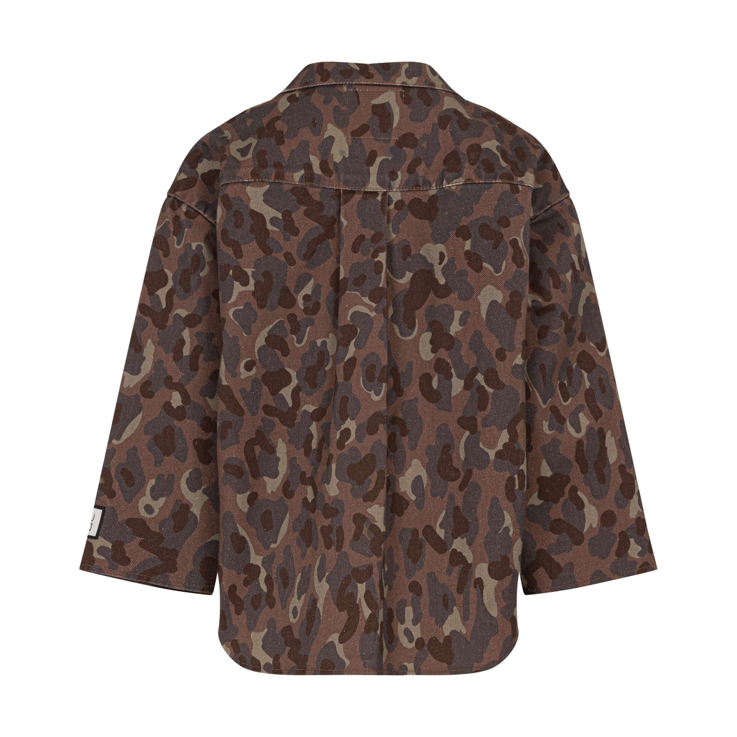 Camicia a giacca per bambine e ragazze in jeans telato fantasia camouflage fondo marrone; vestibilitร over con tascone sul lato sinistro.