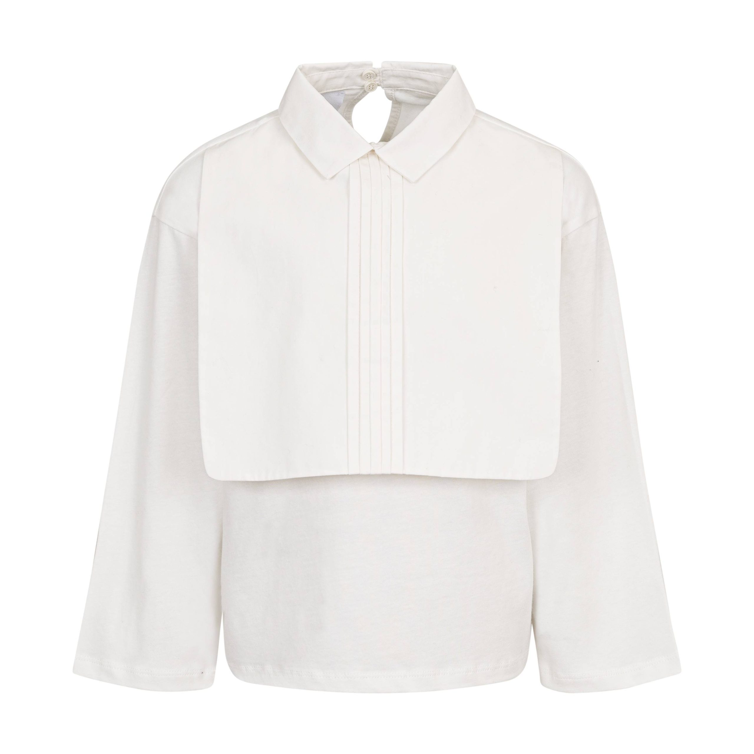 Camicia con abbottonatura a metร con colletto e pettorina anteriore;polsini senza bottonie vestibilitร leggermente over.