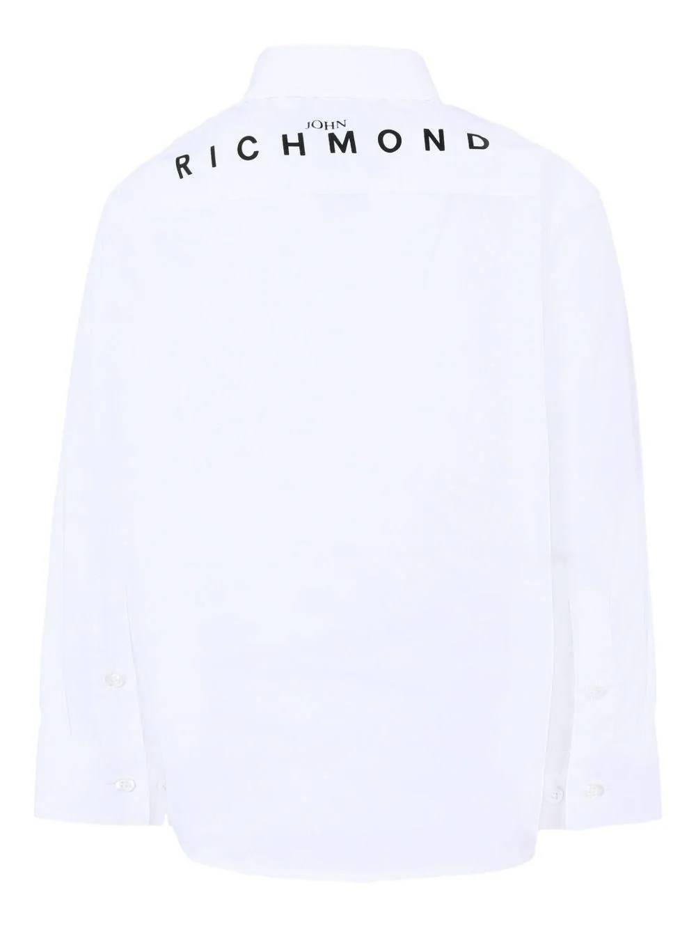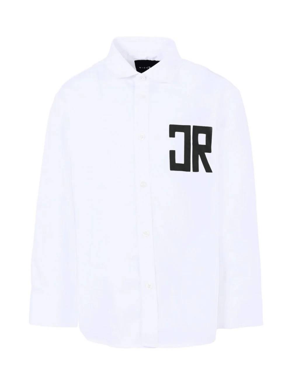 Camicia bianca in cotone per bambini e ragazzi, a maniche lunghe, con colletto a punta e chiusura frontale con bottoni. ร decorata con logo nero sul retro e sul petto. Composizione: 100%cotone
