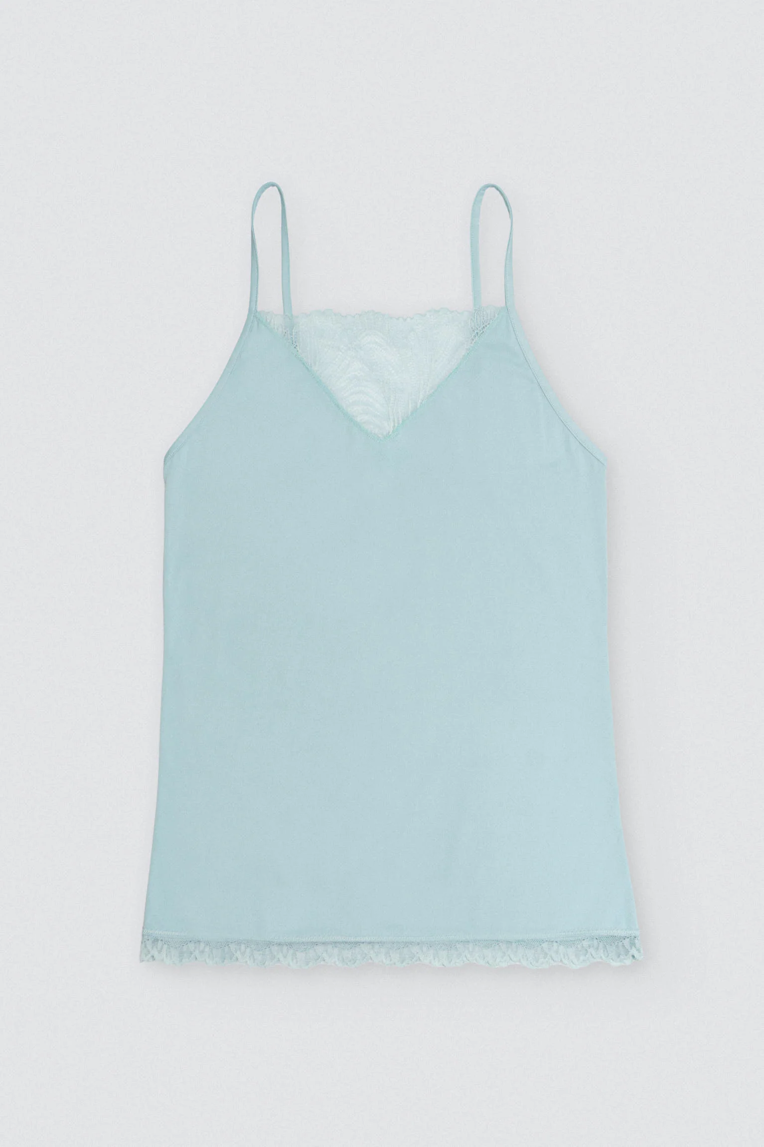Canotta in tessuto microfibra con dettaglio in pizzo a foglia sul davanti e sul fondo. Un design che fonde stile e sensualitร . Colore verde blu.