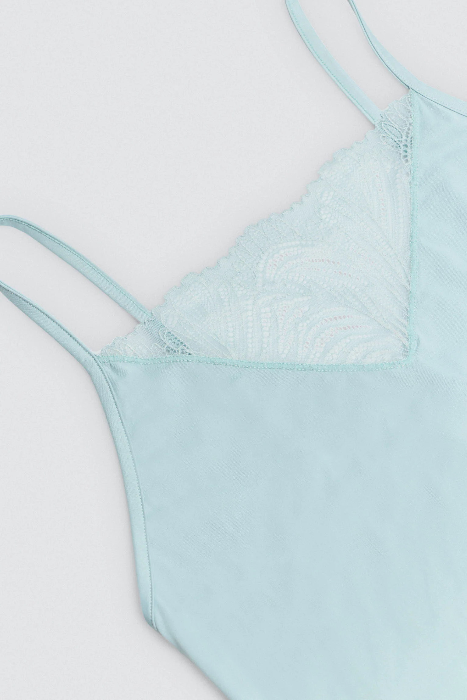 Canotta in tessuto microfibra con dettaglio in pizzo a foglia sul davanti e sul fondo. Un design che fonde stile e sensualitร . Colore verde blu. 83% Poliammide, 17% Elastan
