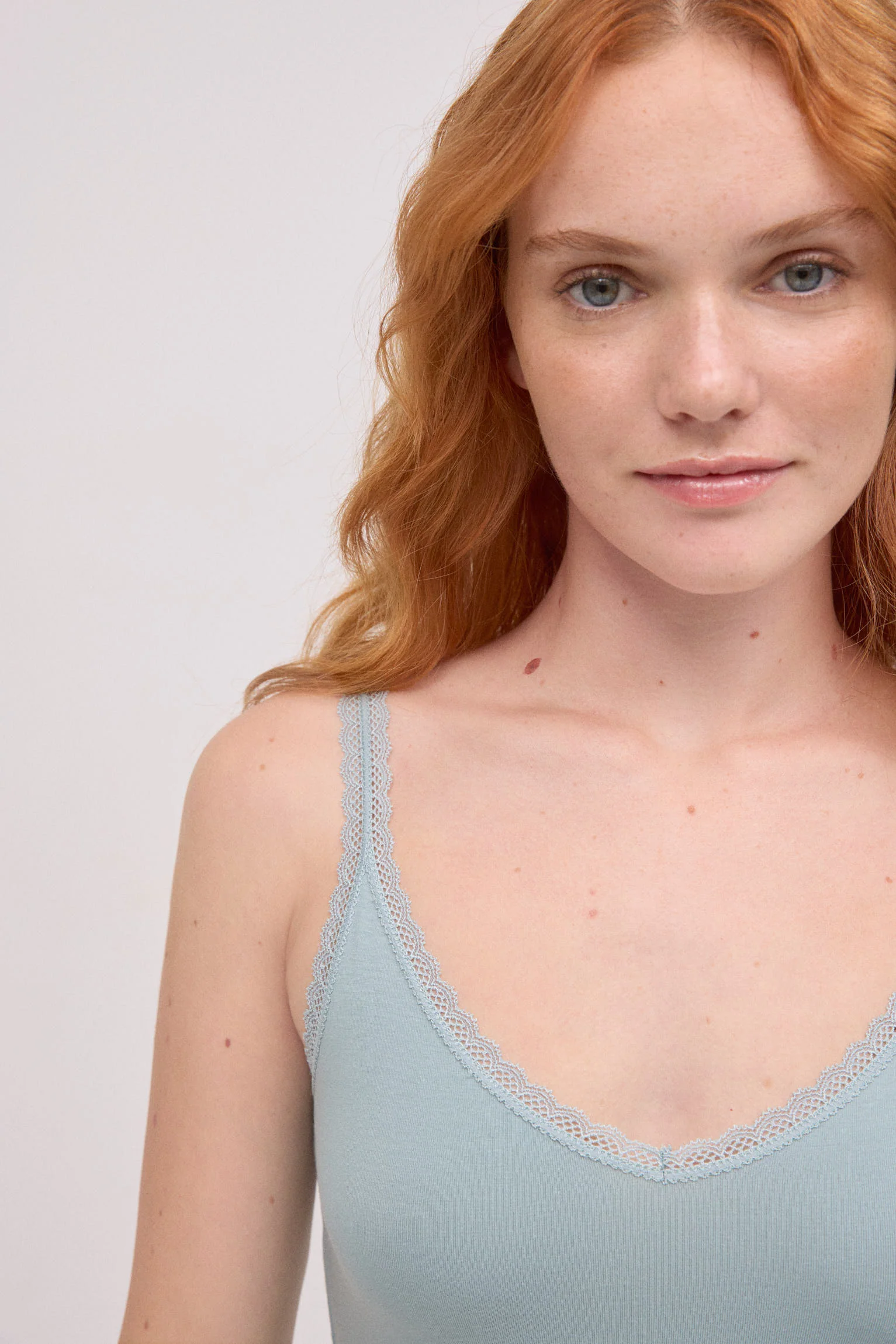 Top con spalline sottili in cotone naturale, perfetto per la morbidezza e il comfort di tutti i giorni. Il suo design verde semplice presenta un delicato piping sullo scollo e sulle spalline, che aggiunge un tocco femminile senza rinunciare alla funzionalitร . Perfetto da indossare sia all’interno che all’esterno in totale comfort.