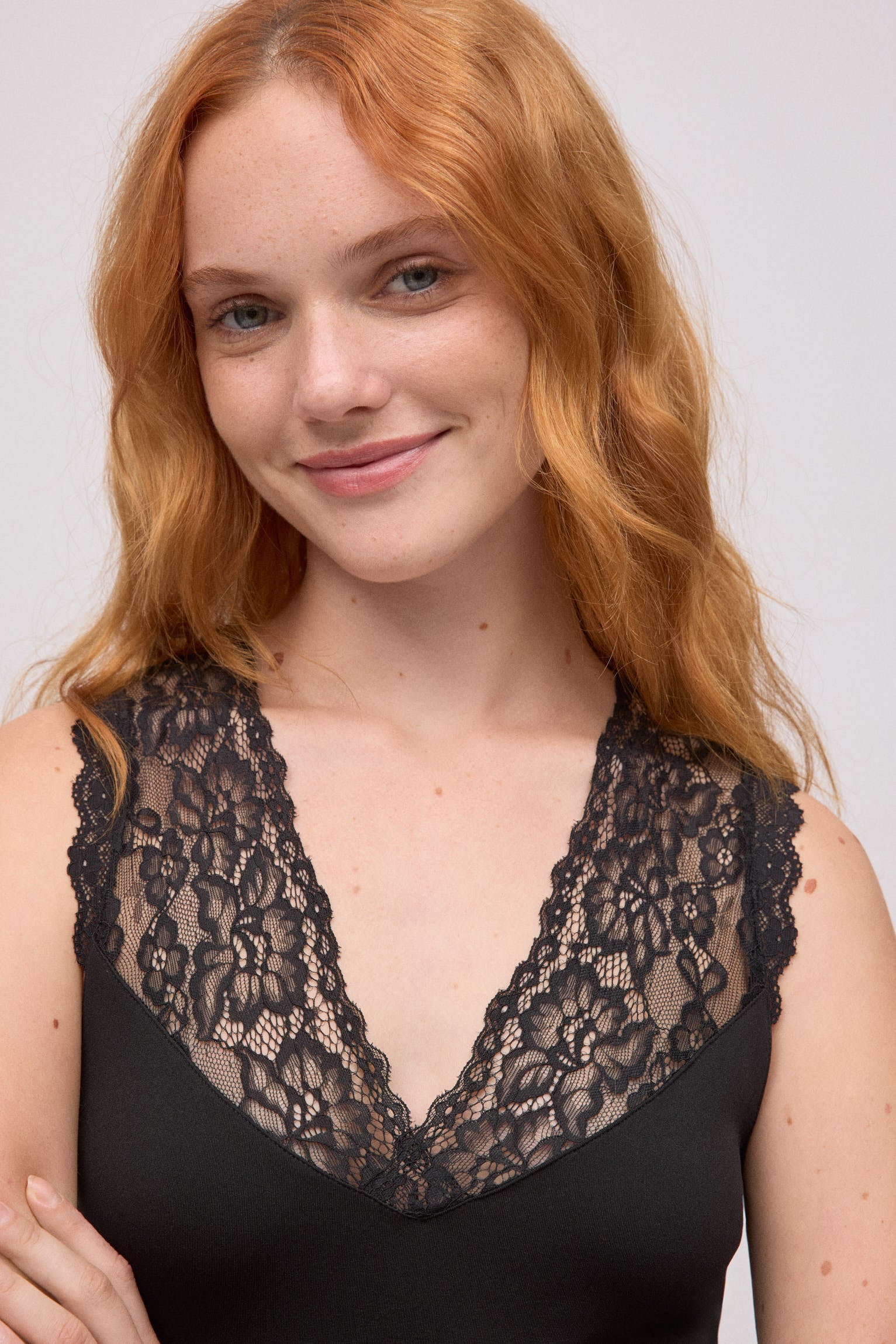 - Dettaglio in pizzo sullo scollo per una finitura sofisticata.