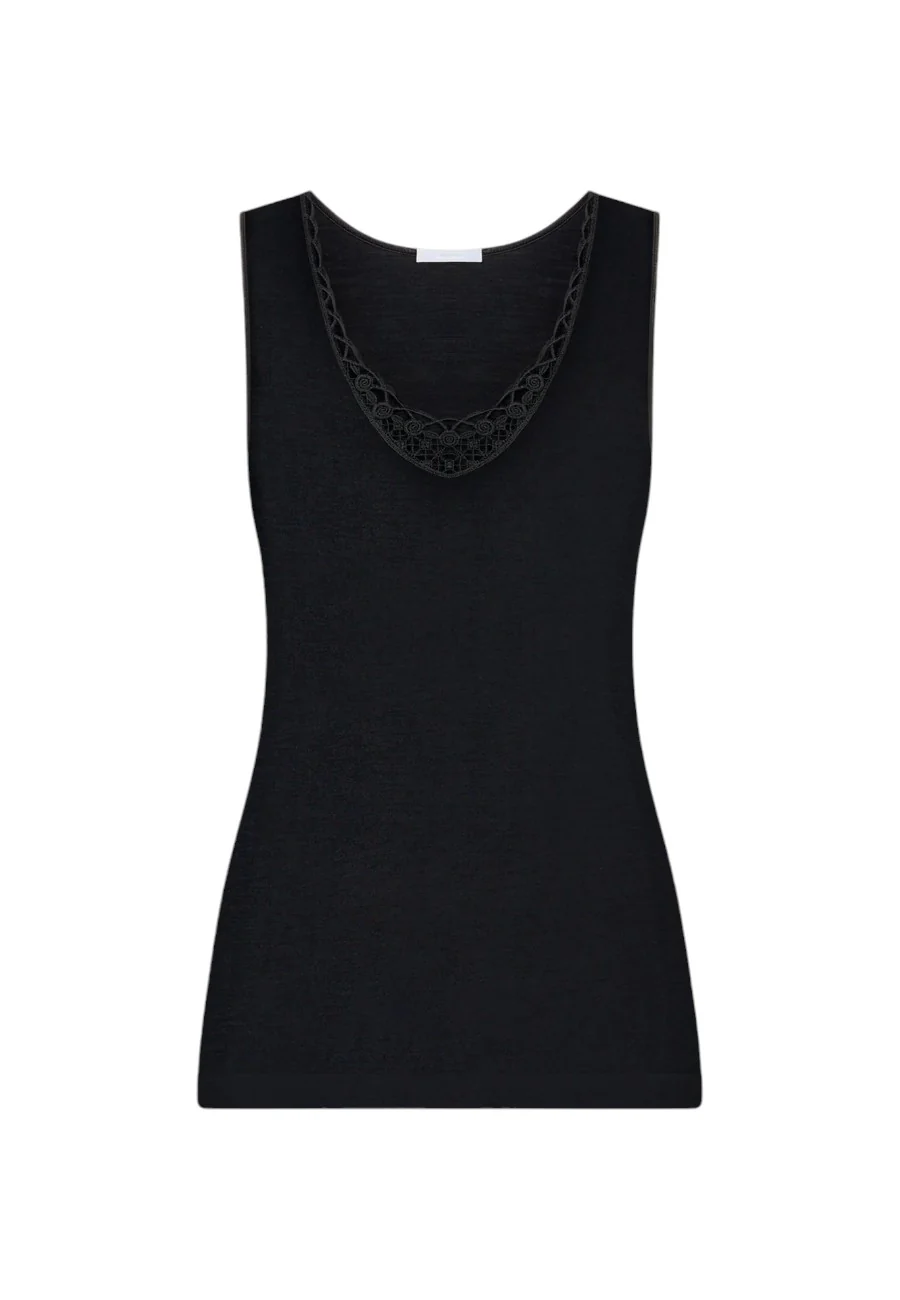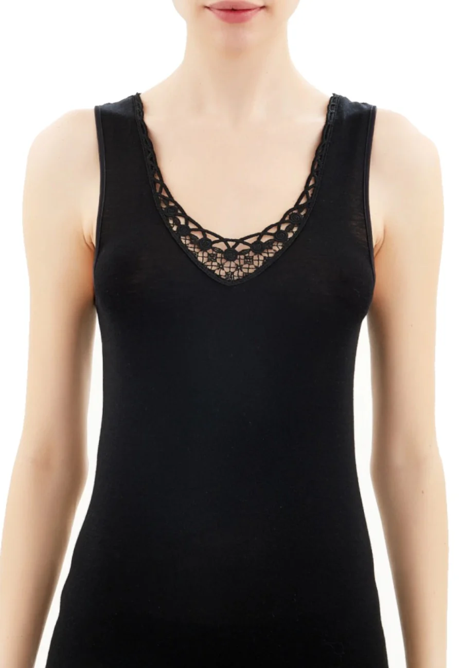 Canottiera a spalla larga in preziosa maglia unita di lana e seta caratterizzata dal bordo della scollatura in pizzo macramè. Il pizzo elasticizzato, delicato ma resistente, decora con un tocco di raffinatezza, adattandosi armoniosamente alle forme del corpo senza stringere. Questo capo è caldo e morbido grazie alla lana merino mixata sapientemente alla fibra più liscia della seta.