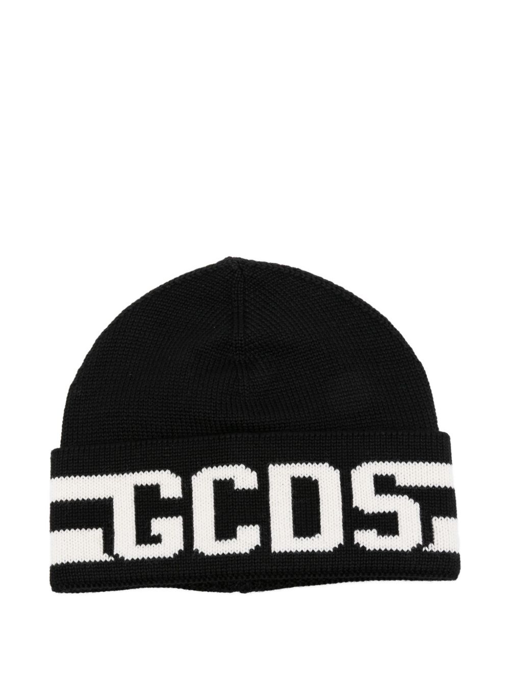 Cappello in lana nero con logo GCDS bianco, unisex.