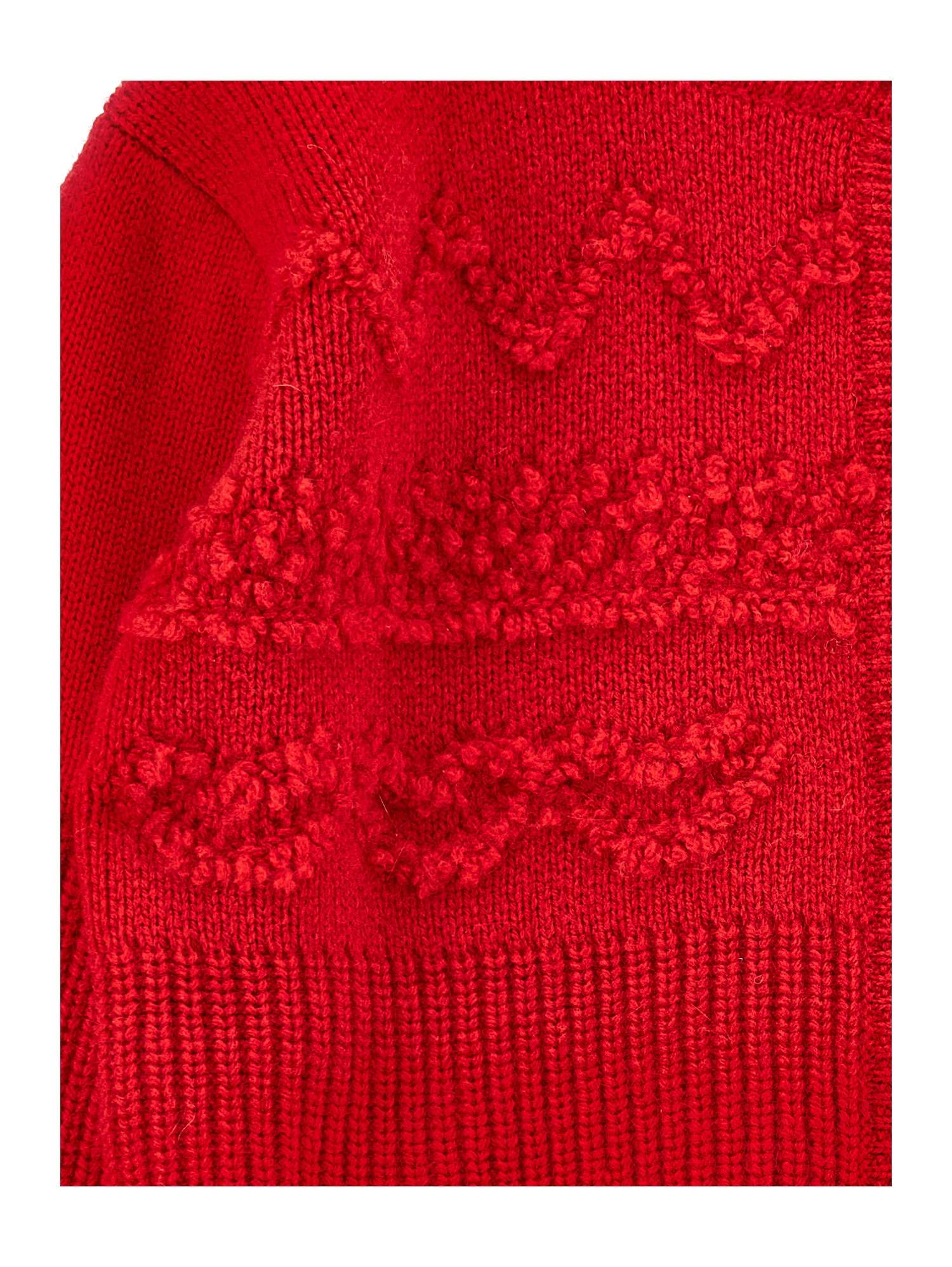 Cardigan Monnalisa in tessuto 100%, colore rosso, con chiusura a bottoni e motivo a cuori. Presenta polsini a coste e maniche a spalla bassa.