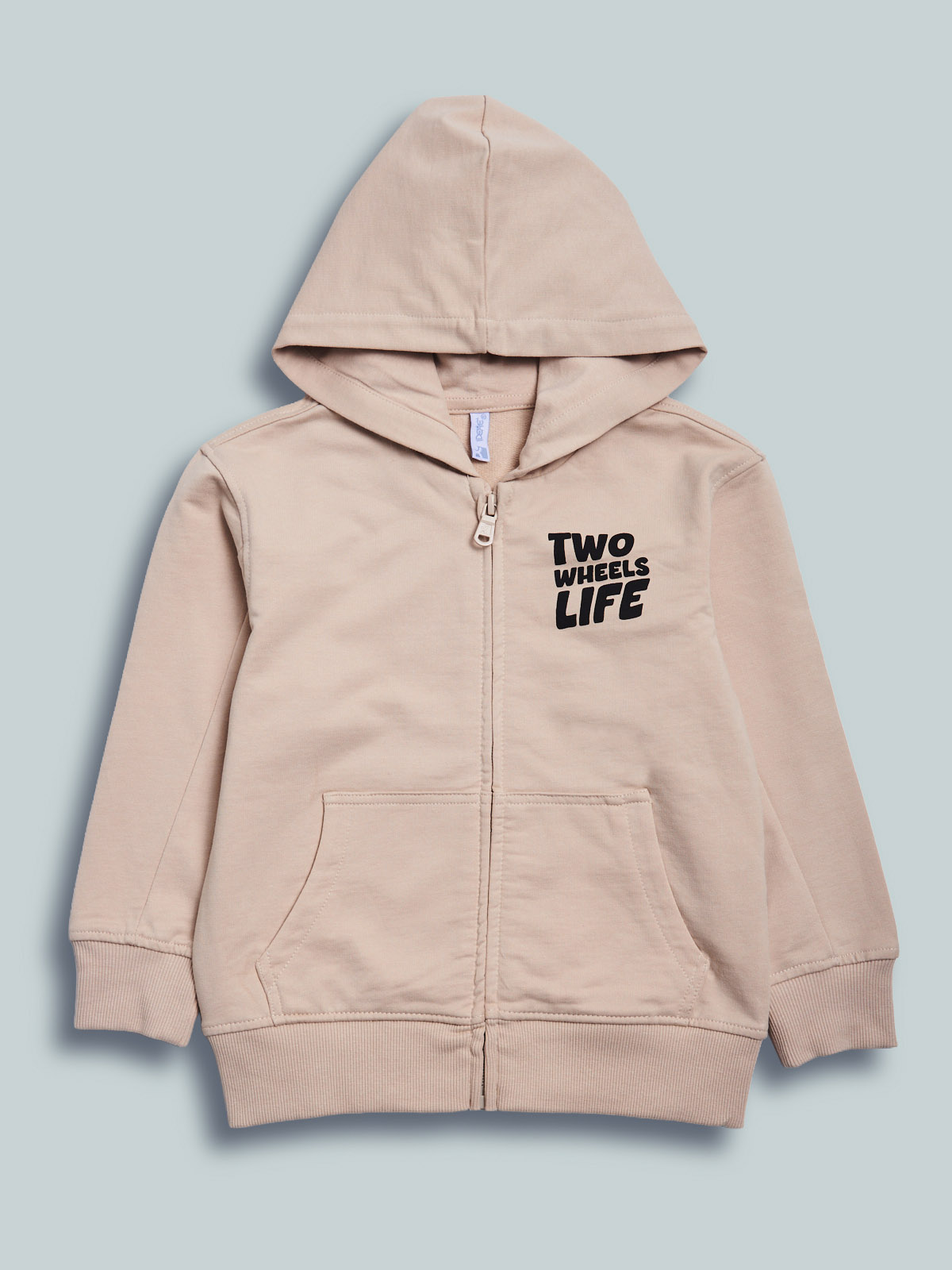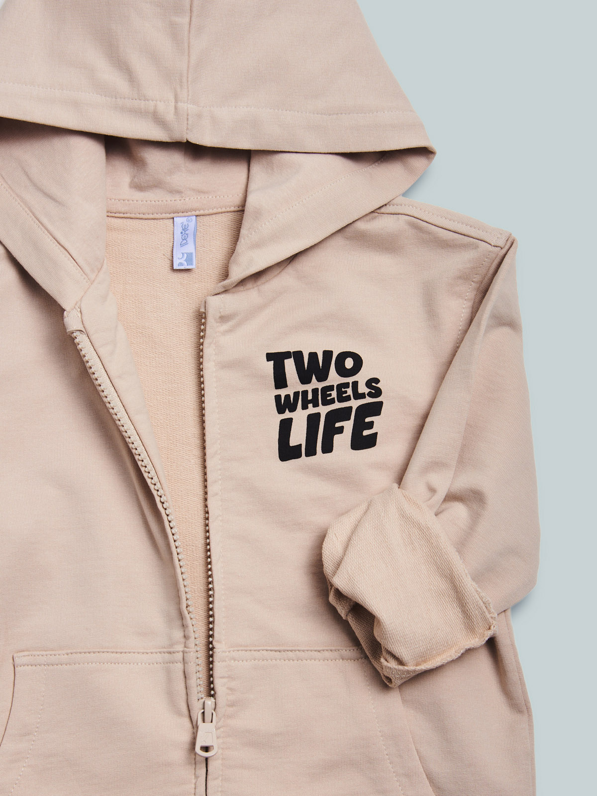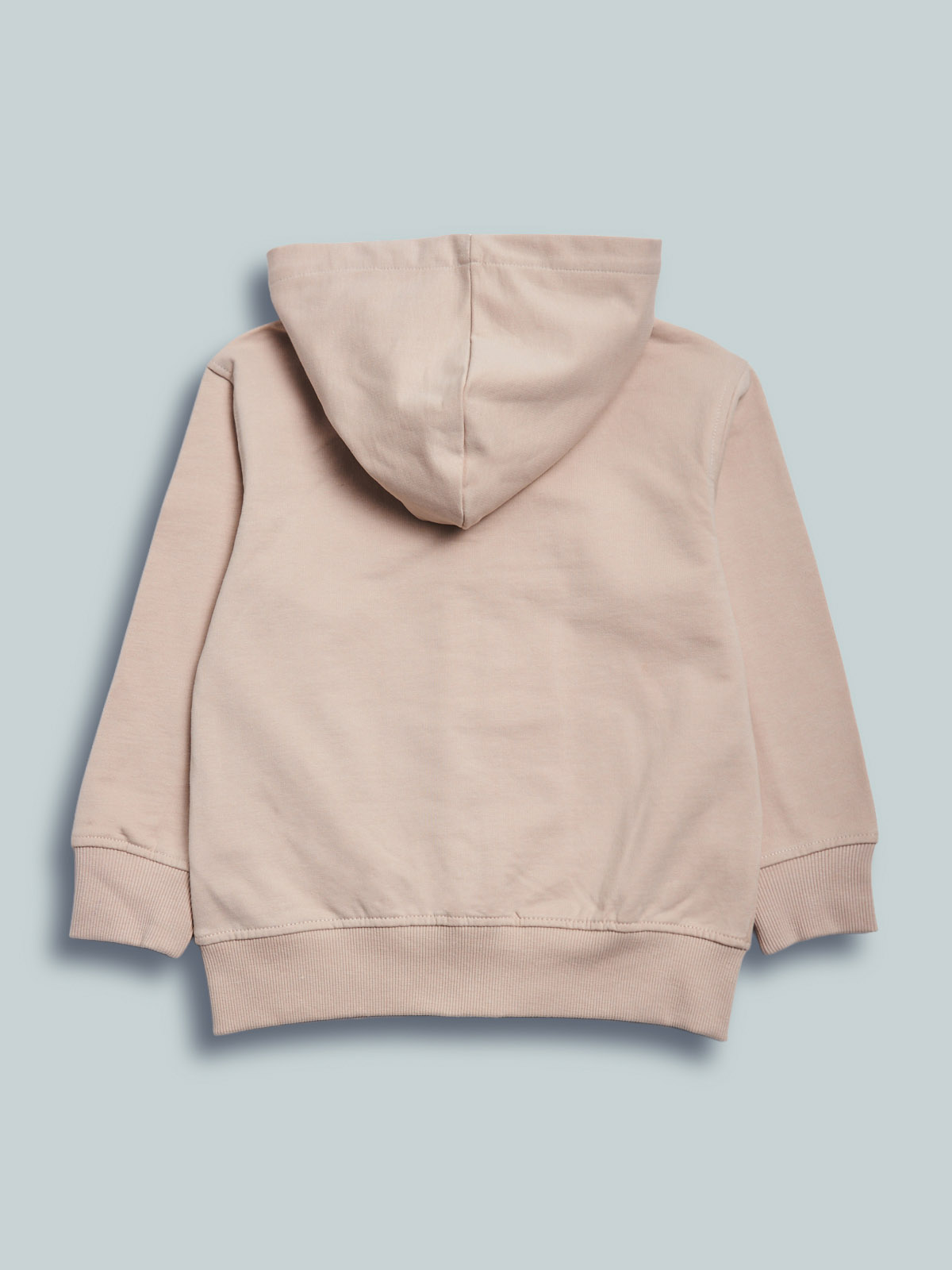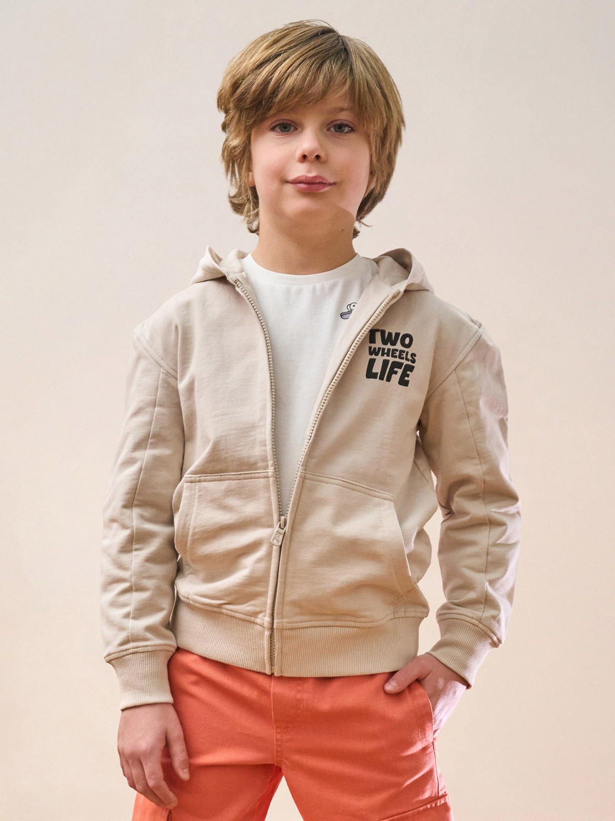 Cardigan con cappuccio in morbida felpa leggera. Polsi e fondo in costina, pratica tasca a marsupio sul davanti e apertura con zip. Stampa sul petto. Un capo basico e confortevole, da indossare tutti i giorni.