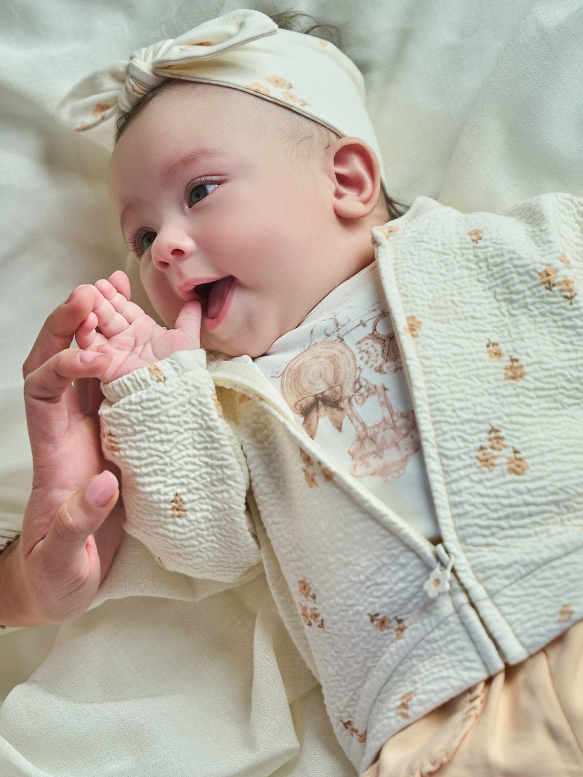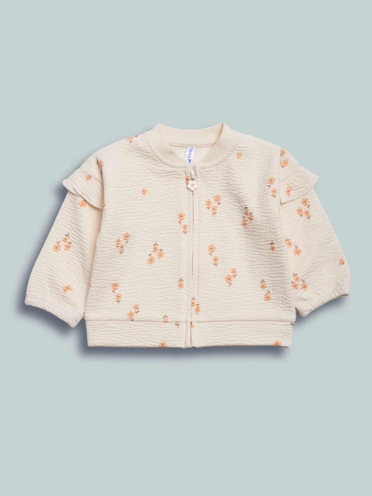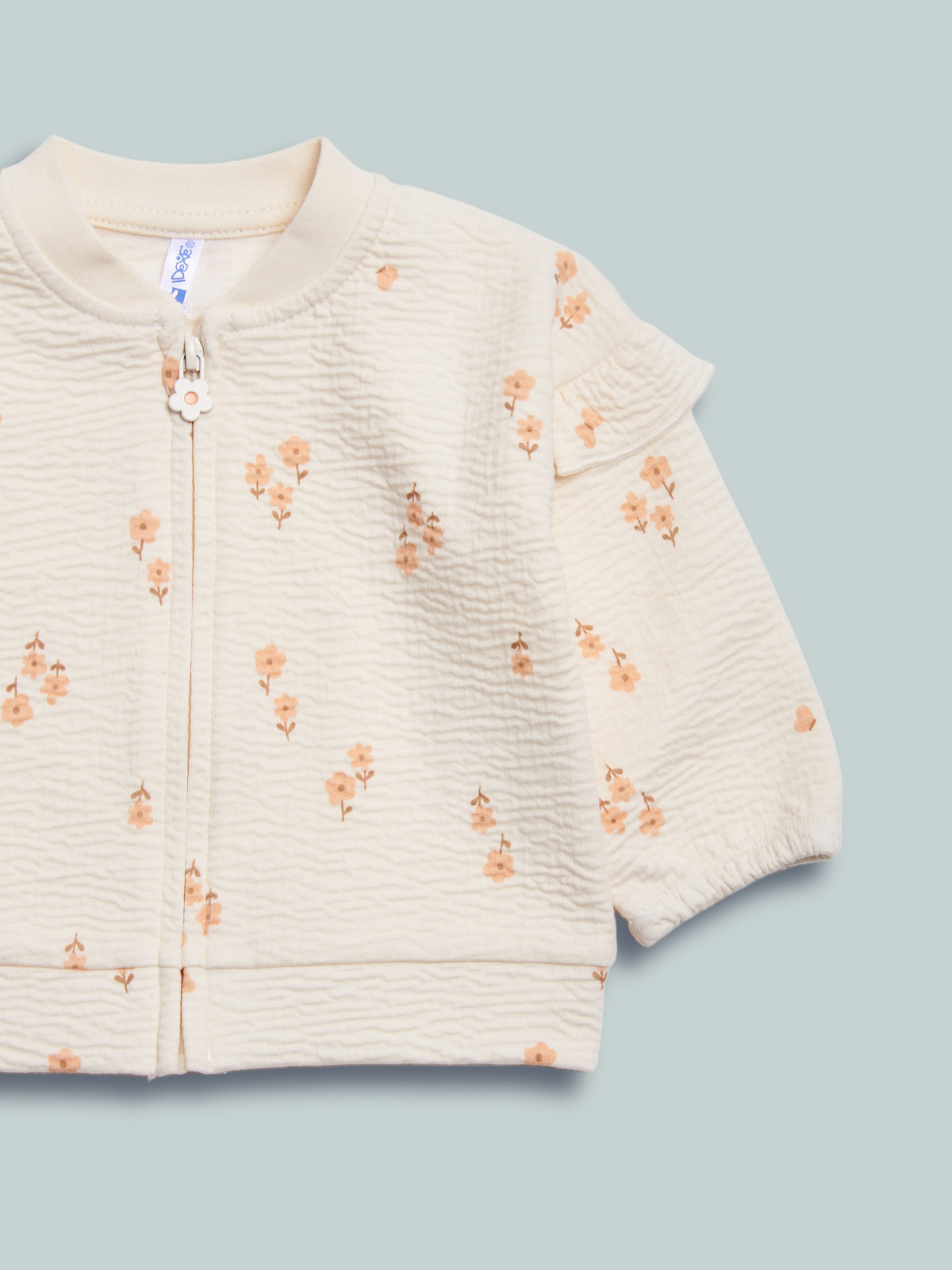 Cardigan in morbida maglia goffrata elasticizzata stampata. Vestizione veloce e pratica grazie a zip frontale e tiretto personalizzato. Un capo adatto a tutte le occasioni.