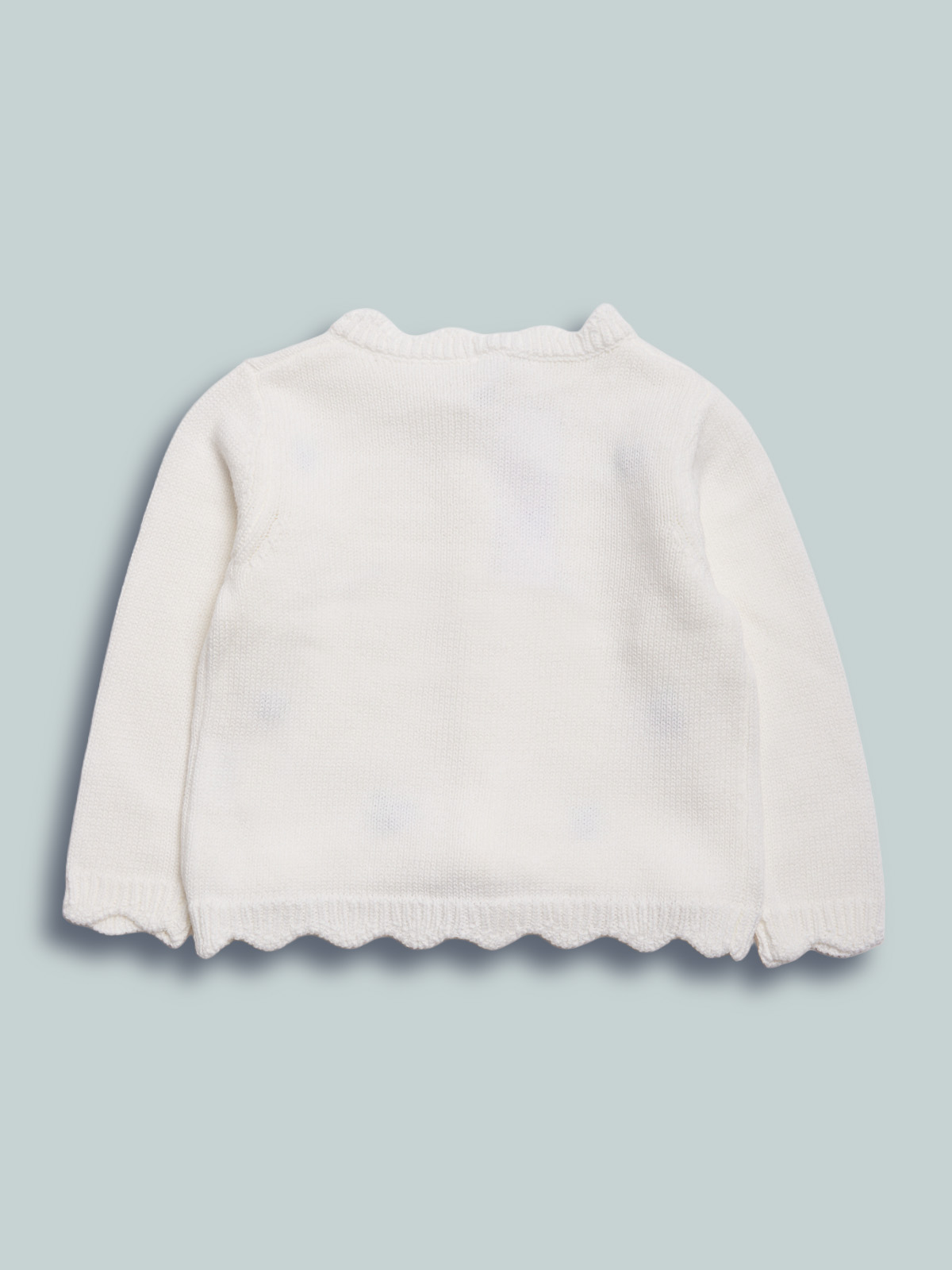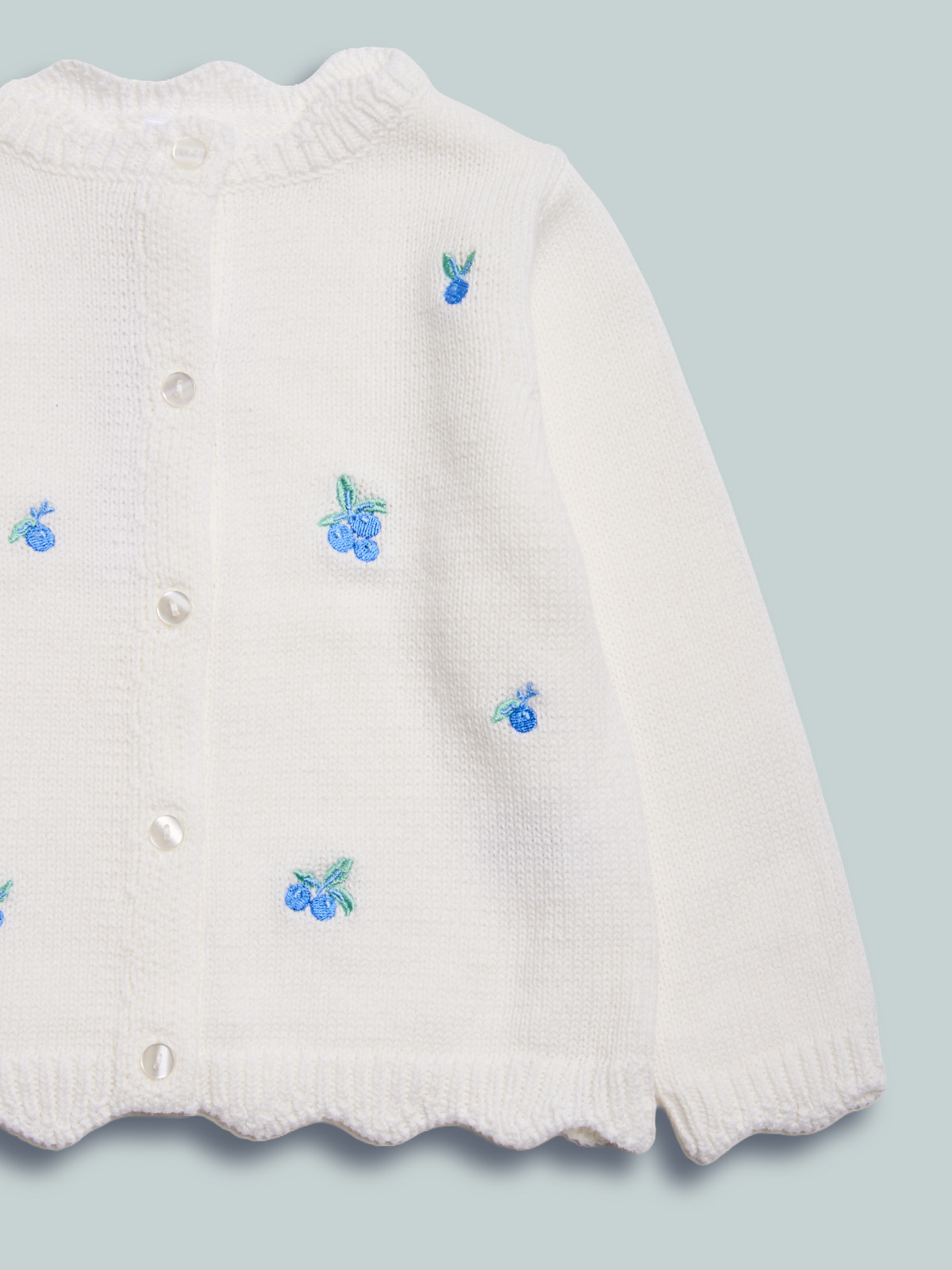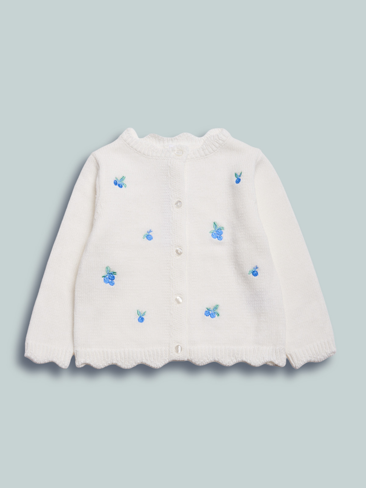 Cardigan in morbida maglia di cotone manica lunga. Simpatici ricami mirtilli sul davanti per maggiore femminilitร . Un capo sfizioso con dettaglio bon ton.