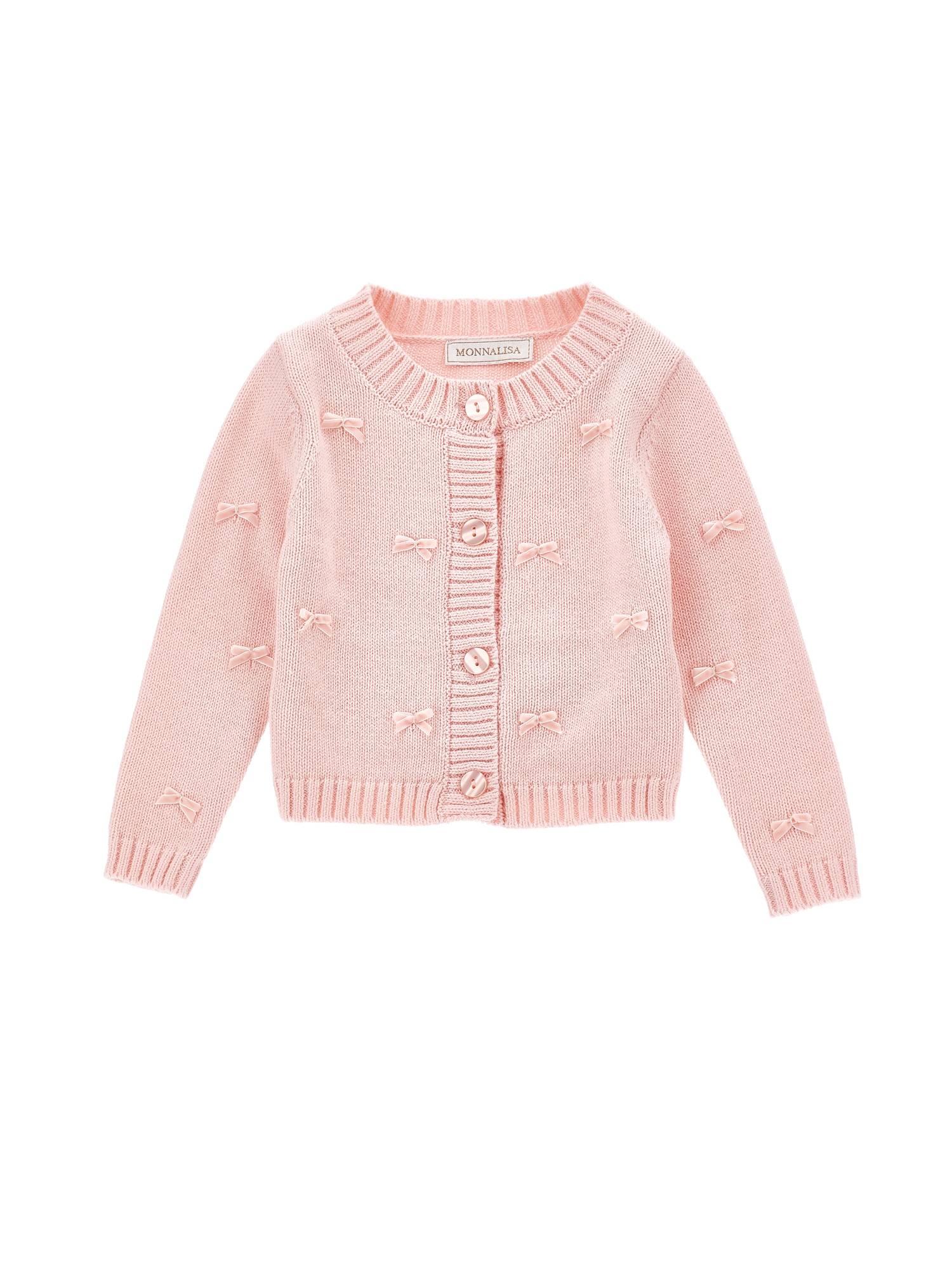 Cardigan per neonata Monnalisa, il prodotto presenta un colore rosa, chiusura frontale con abbottonatura, scollo rotondo, maniche lunghe, dettaglio fiocco.