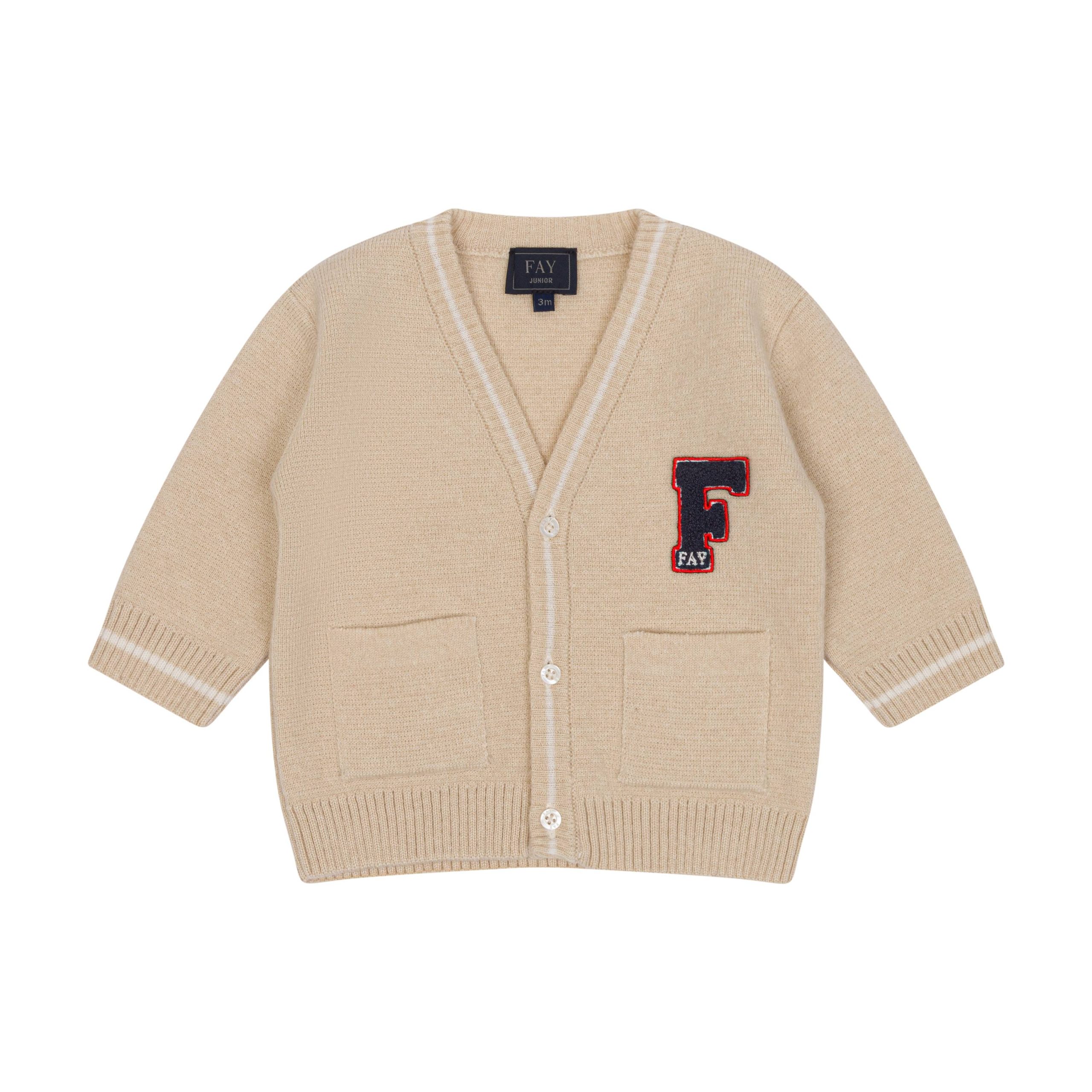 Cardigan in lana color beige per neonato di Fay Kids, chiusura con bottoni frontali. Dettaglio logo ricamato sul davanti a contrasto di colore. Tasche a patta sul davanti.