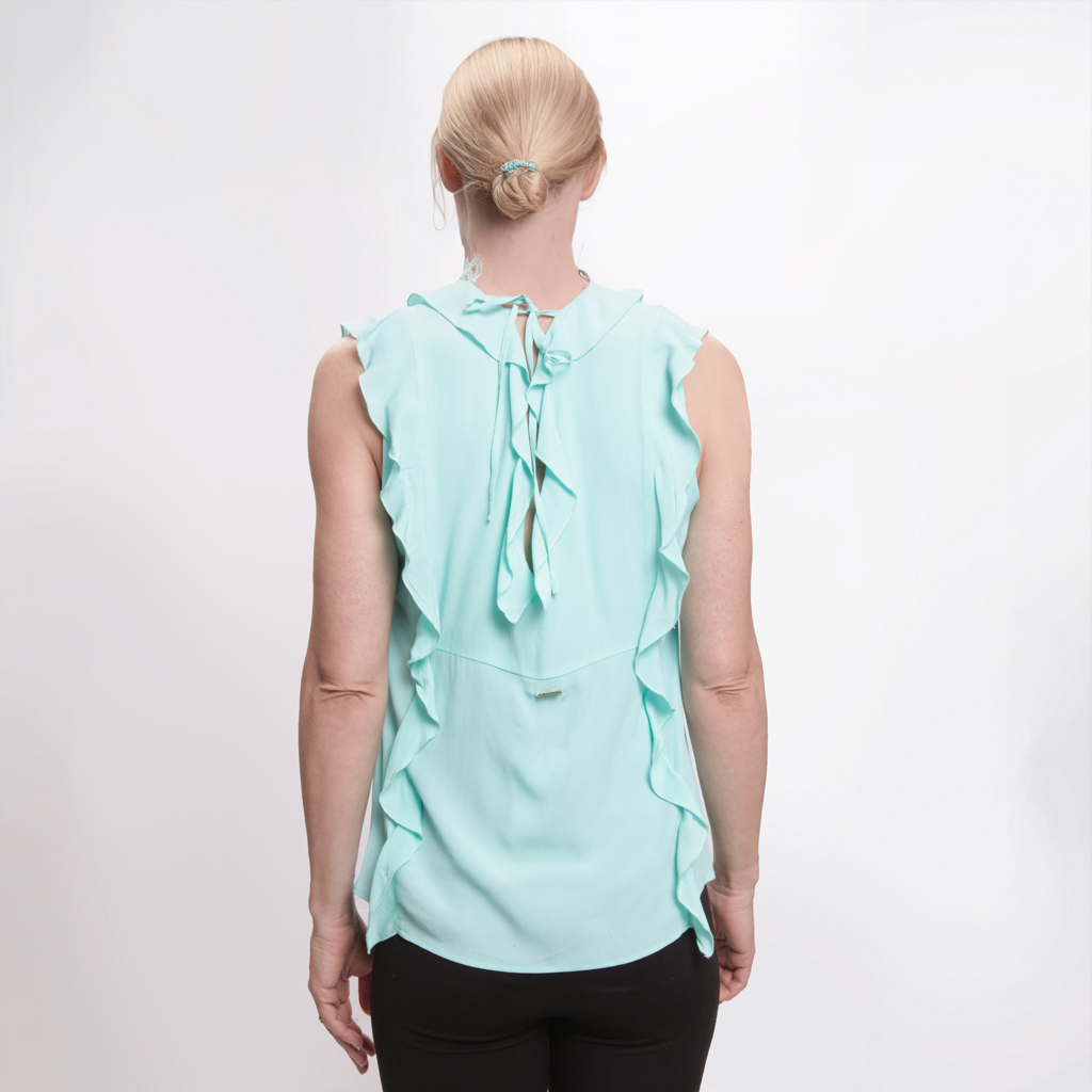 Dettagli Haute Couture e colore vibrante. Questo top firmato Cavalli Class gioca con le trasparenze del pizzo macramè e il movimento dei volant per creare un look romantico e raffinato. La tonalità verde menta/tiffany è ideale per illuminare l’incarnato in ogni stagione.
