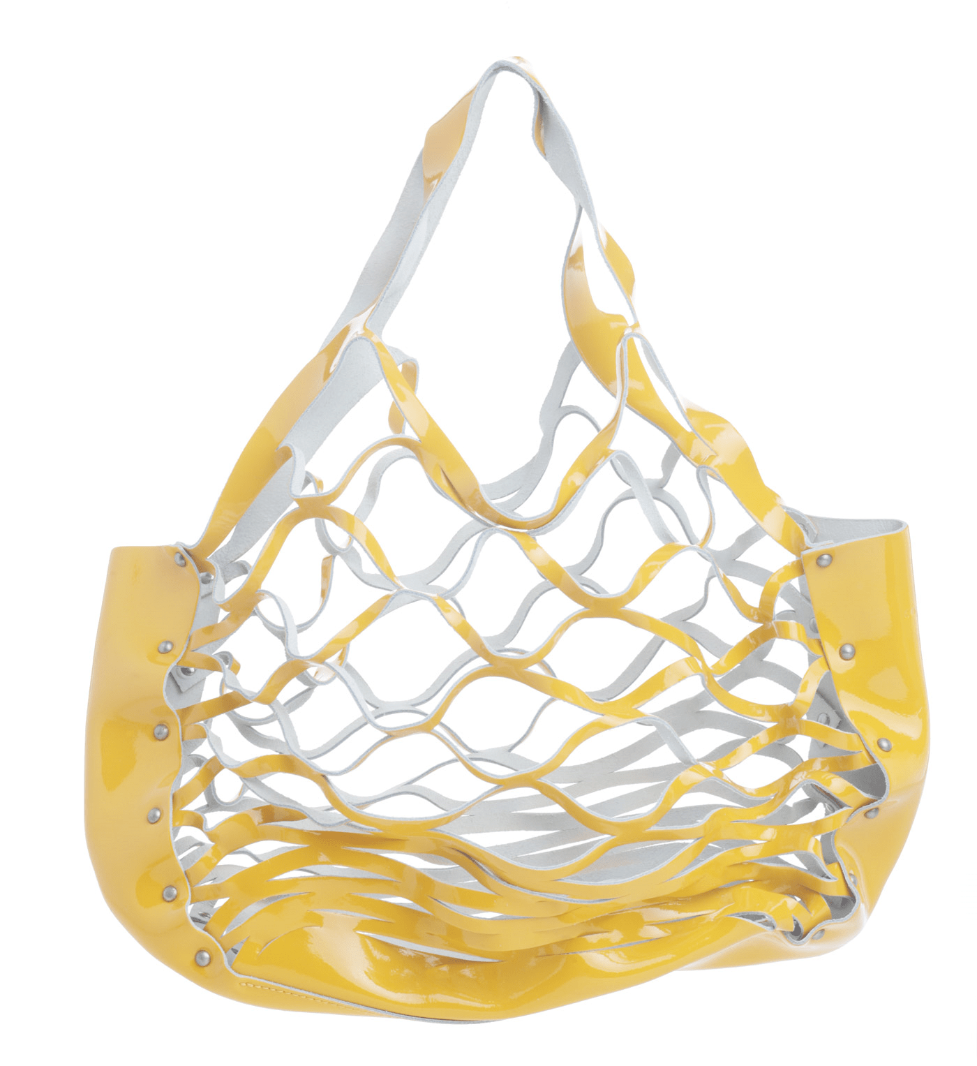La Borsa a Mano a Rete di Coccinelle rappresenta una reinterpretazione moderna e audace della classica borsa da giorno. La struttura esterna, realizzata in pelle plasticata di un giallo intenso, crea un gioco di intrecci a rete che dona leggerezza e dinamismo alla silhouette. Questo modello si distingue per la sua costruzione aperta, priva di chiusura, che enfatizza lo stile minimalista e avanguardista del design.