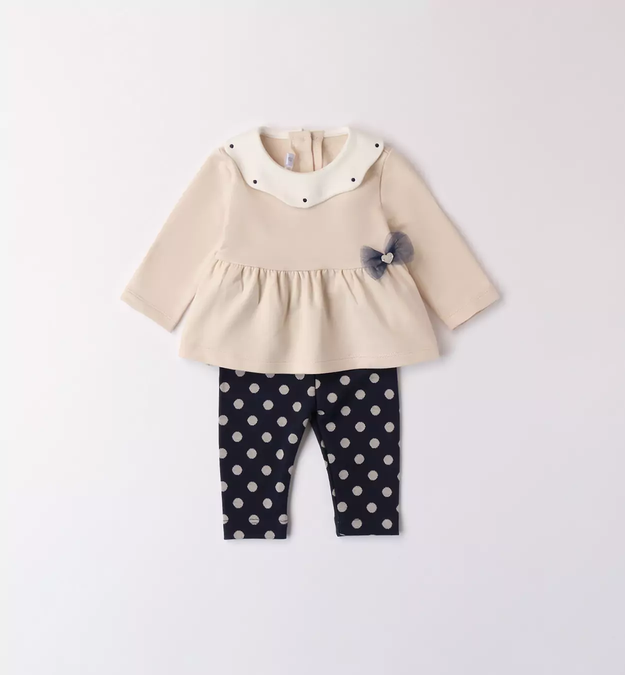 Completo due pezzi per neonata Minibanda 1-24 mesi. La maglia รจ realizzata in felpa stretch invernale e presenta apertura sulla schiena con bottoni, colletto e fiocco in tulle. I leggings sono in tessuto jacquard e hanno vita elasticizzata e fantasia a pois. Scopri tutta la selezione di Completi bimba Minibanda! Acquistando prodotti in cotone, stai sostenendo l’impegno di Minibanda nella missione Better Cotton. La fornitura di questo prodotto avviene tramite un sistema di bilancio di massa e potrebbe non contenere Better Cotton. Leggi di piรน su bettercotton.org/massbalance