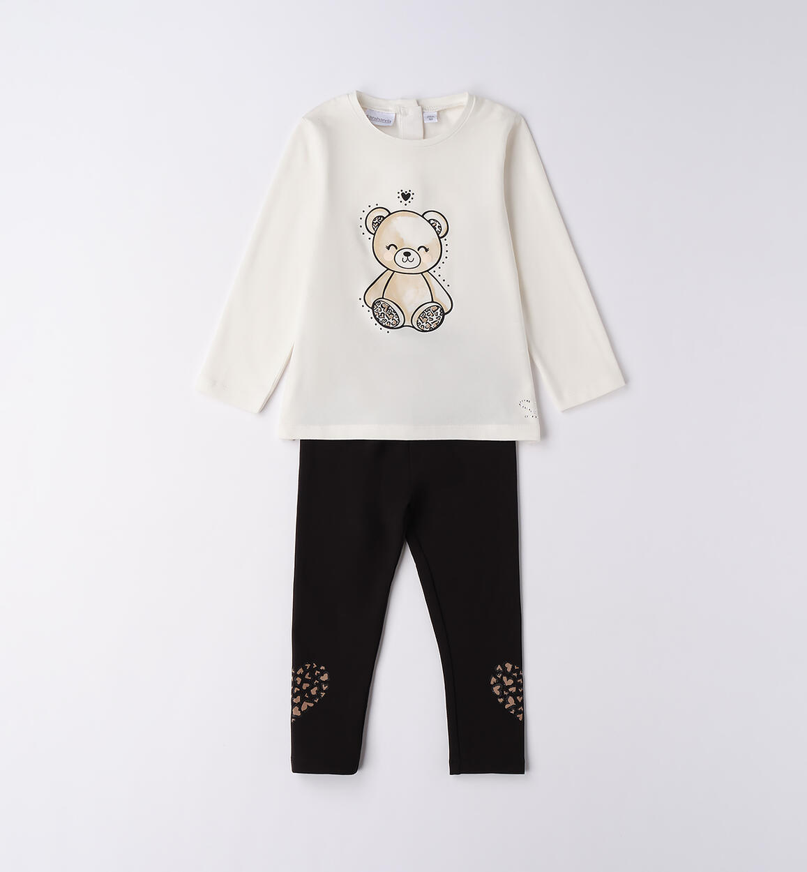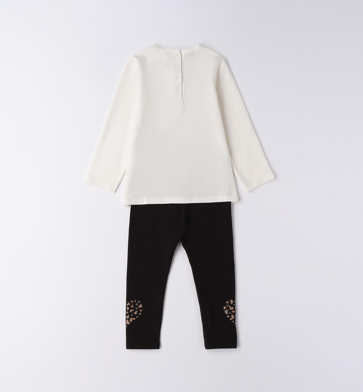 Completo per bambina Sarabanda 9 mesi – 8 anni realizzato in jersey stretch di cotone, manopesca. Modello composro da maglietta e leggings con stampe e strass