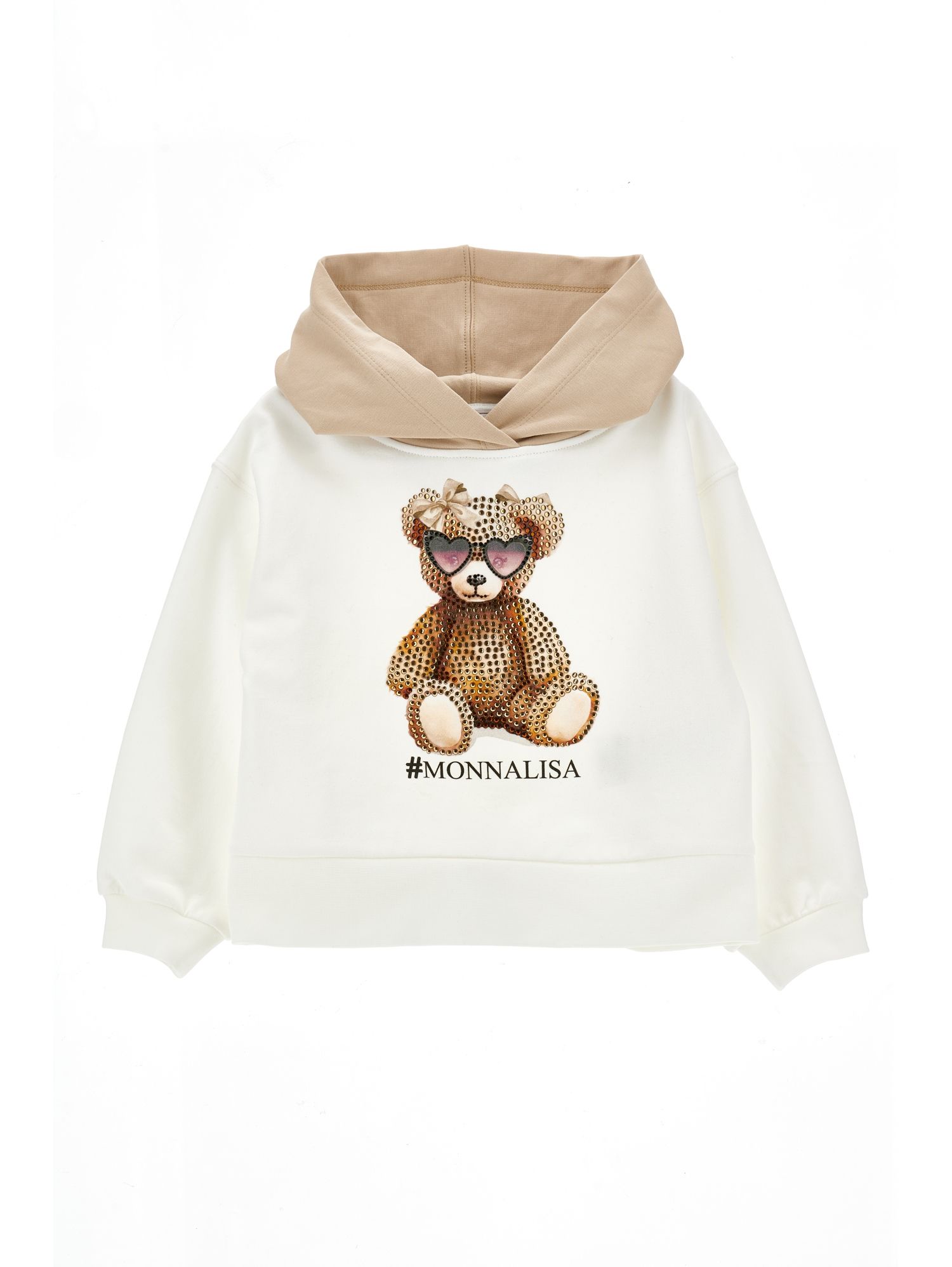 Completo beige composto da felpa e pantaloni. Felpa a maniche lunghe, con cappuccio beige a contrasto, chiusura con zip sul retro, polsini e orlo a costine; pantaloni con vita elasticizzata, tasche laterali, bande laterali bianche e caviglie a costine. ร decorato con orsetto di strass, sulla parte anteriore e logo su una gamba.