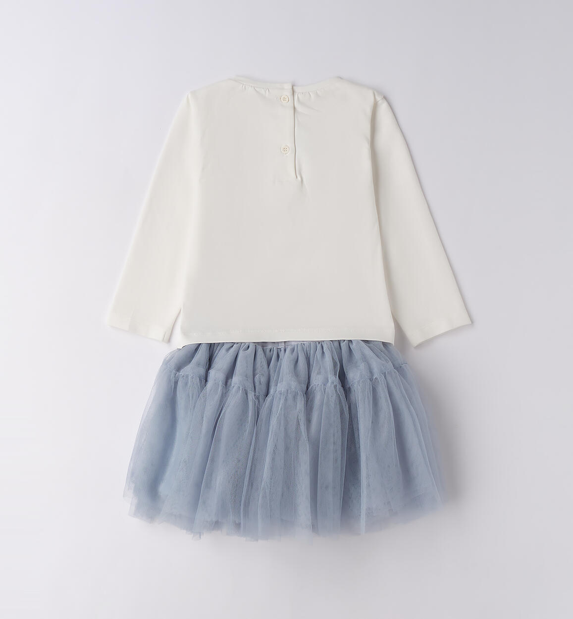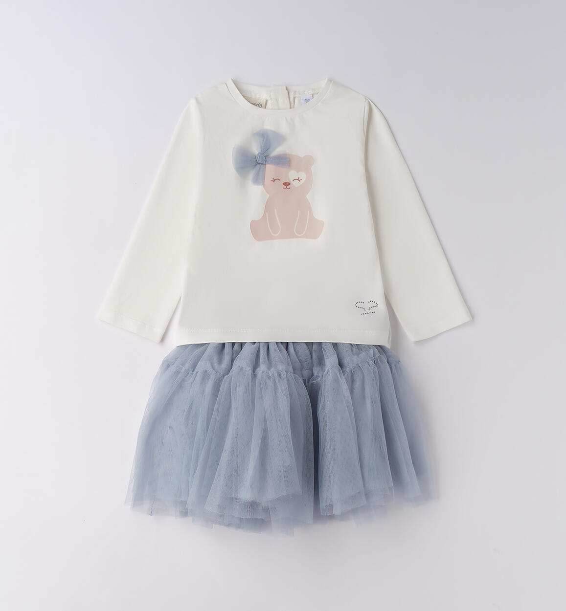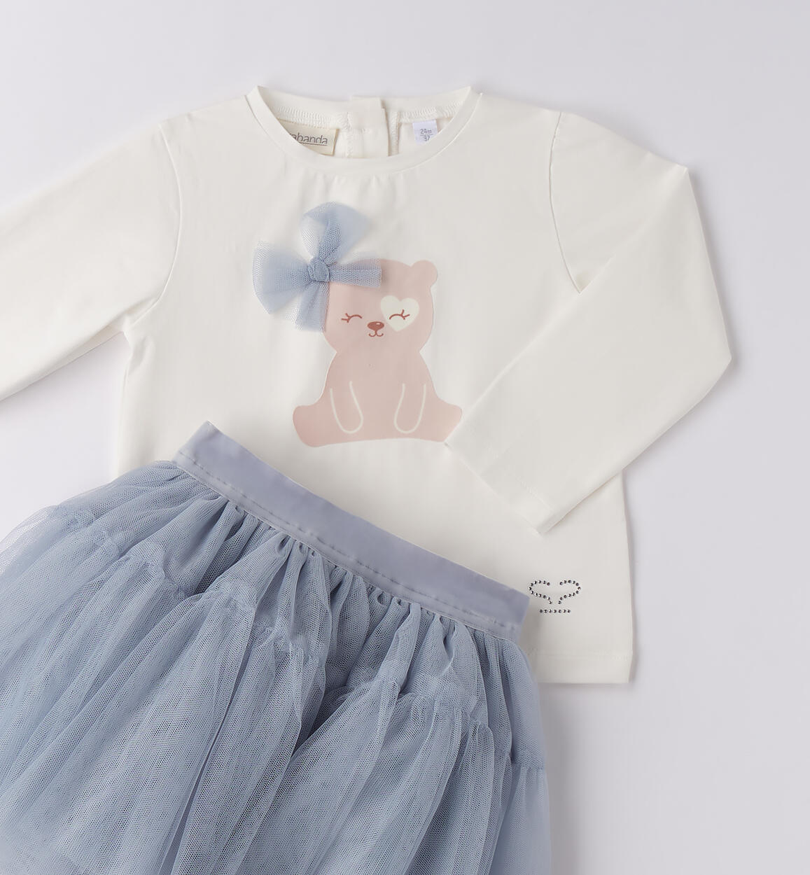 Completo per bambina Sarabanda 9 mesi – 8 anni. Il modello รจ composto da maglietta e gonna. La maglietta รจ in jerset stretch manopesca con applicazione e fiocco in tulle. Gonna in tulle con fodera in satin. Lunghezza al ginocchio