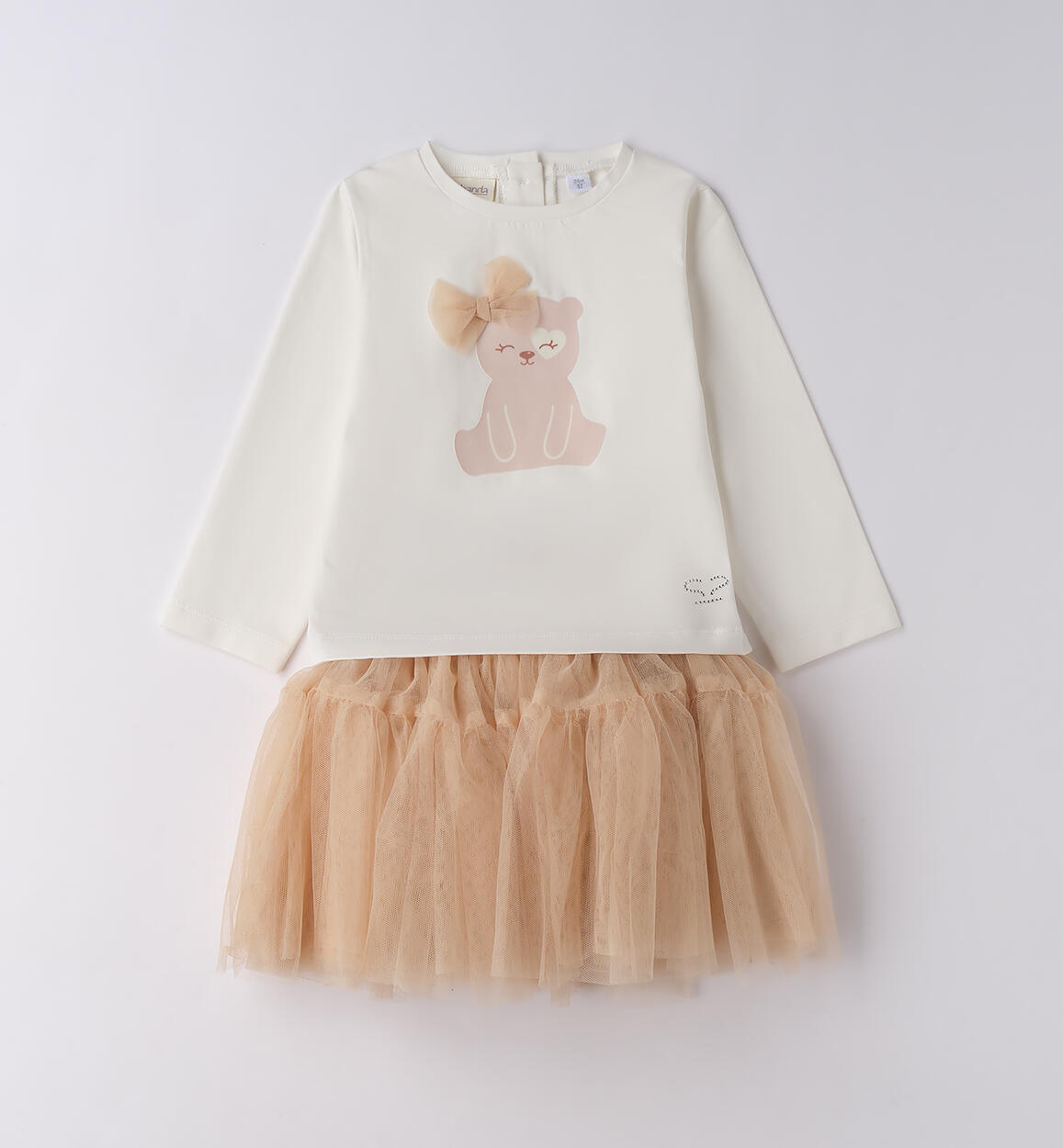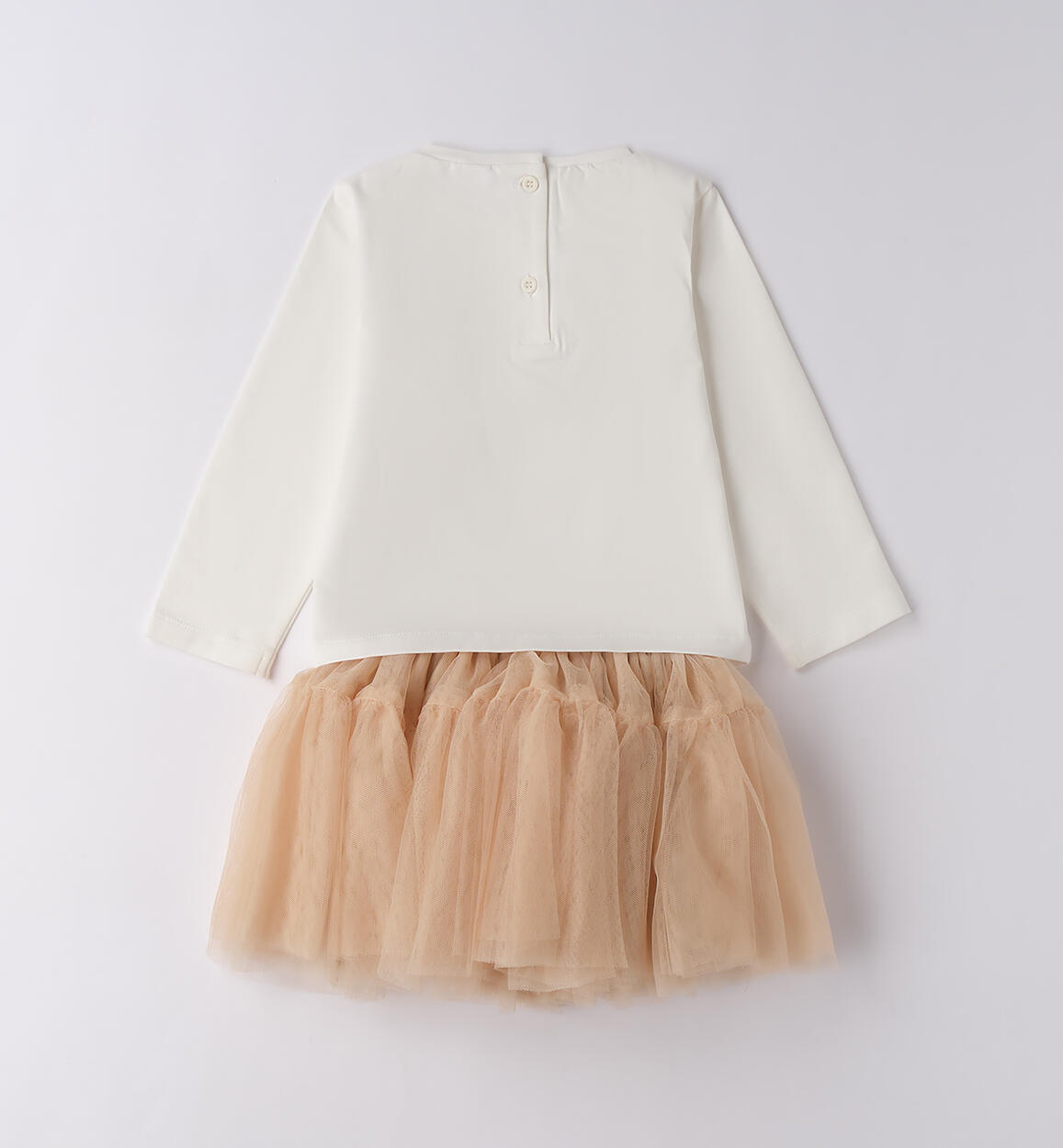 Completo per bambina Sarabanda 9 mesi – 8 anni. Il modello รจ composto da maglietta e gonna. La maglietta รจ in jerset stretch manopesca con applicazione e fiocco in tulle. Gonna in tulle con fodera in satin. Lunghezza al ginocchio Composizione Colore AVION-3825: 100%Poliestere – 95%Cotone 5%Elastan Colore BEIGE-0924: 100%Poliestere – 95%Cotone 5%Elastan