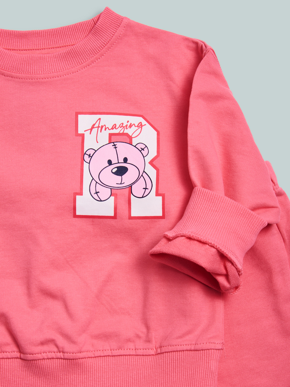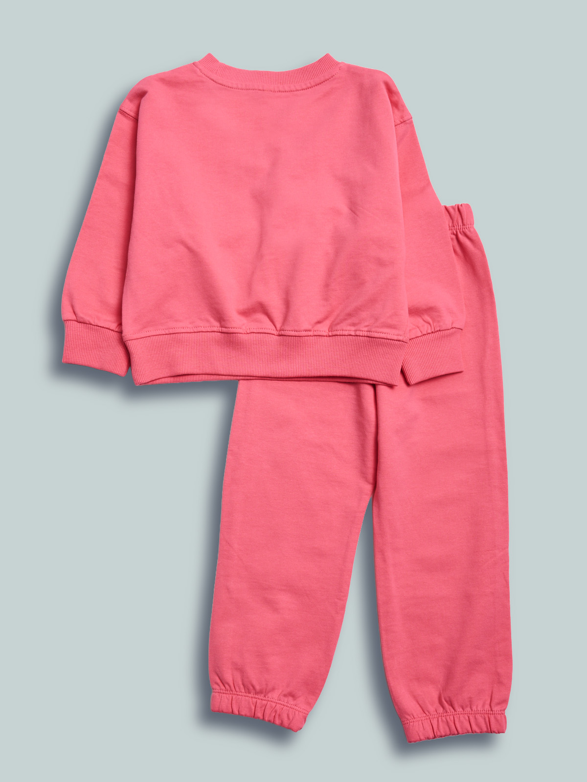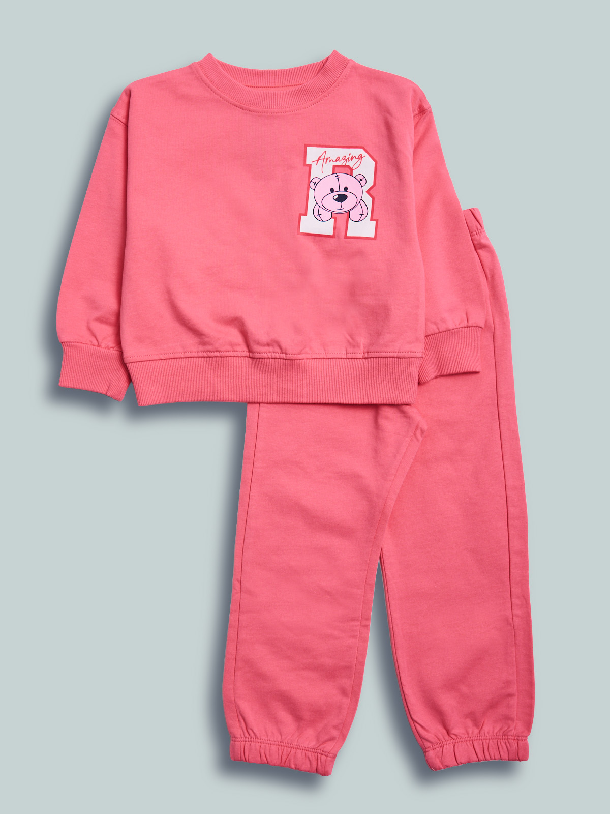 Completo due pezzi in leggera e morbida felpa. Maglia girocollo con stampa orsetto sul davanti sinistro. Pantaloni con vita elasticata per maggiore comoditร . Un completo ideale da indossare a scuola e nel tempo libero.
