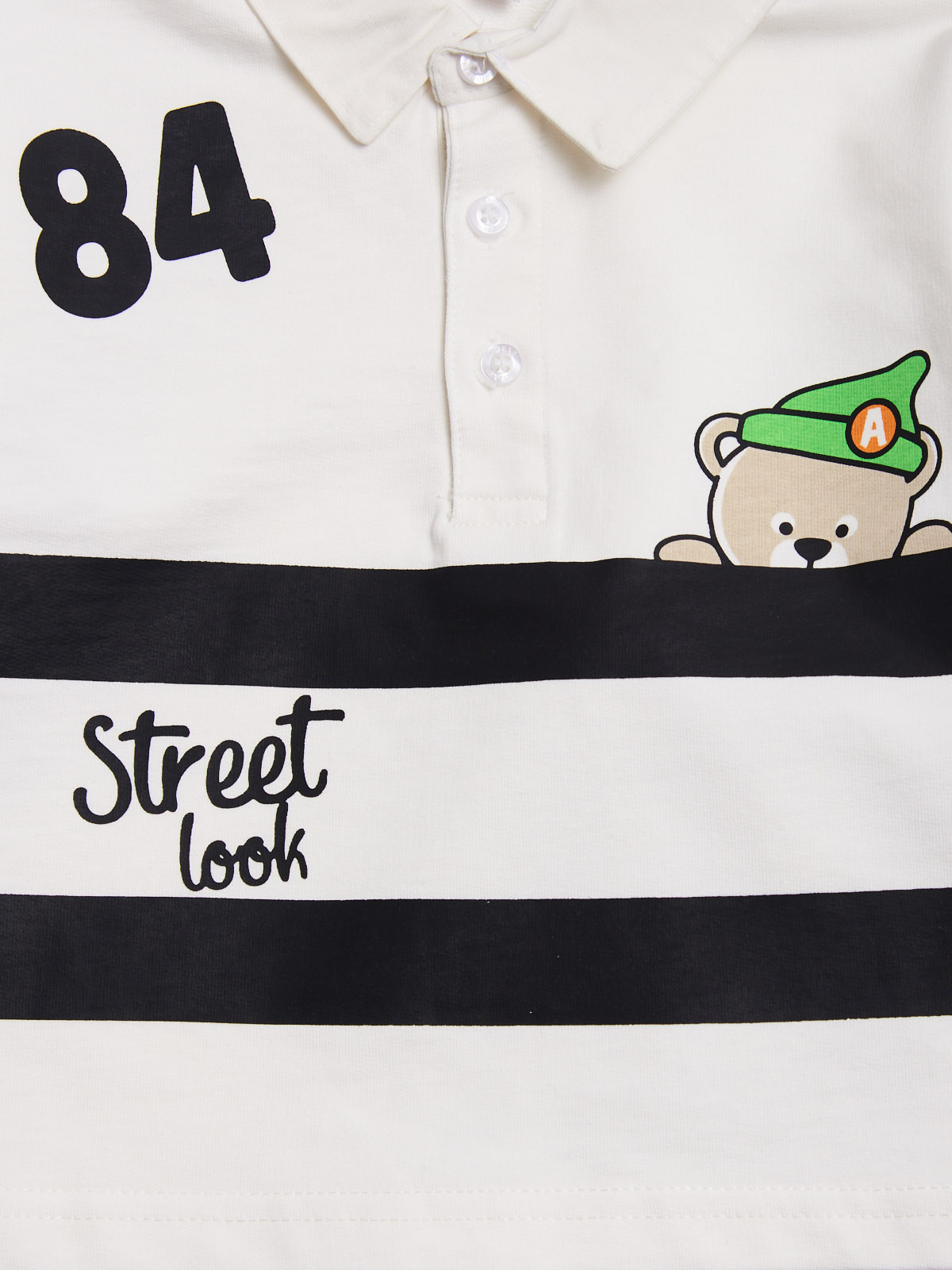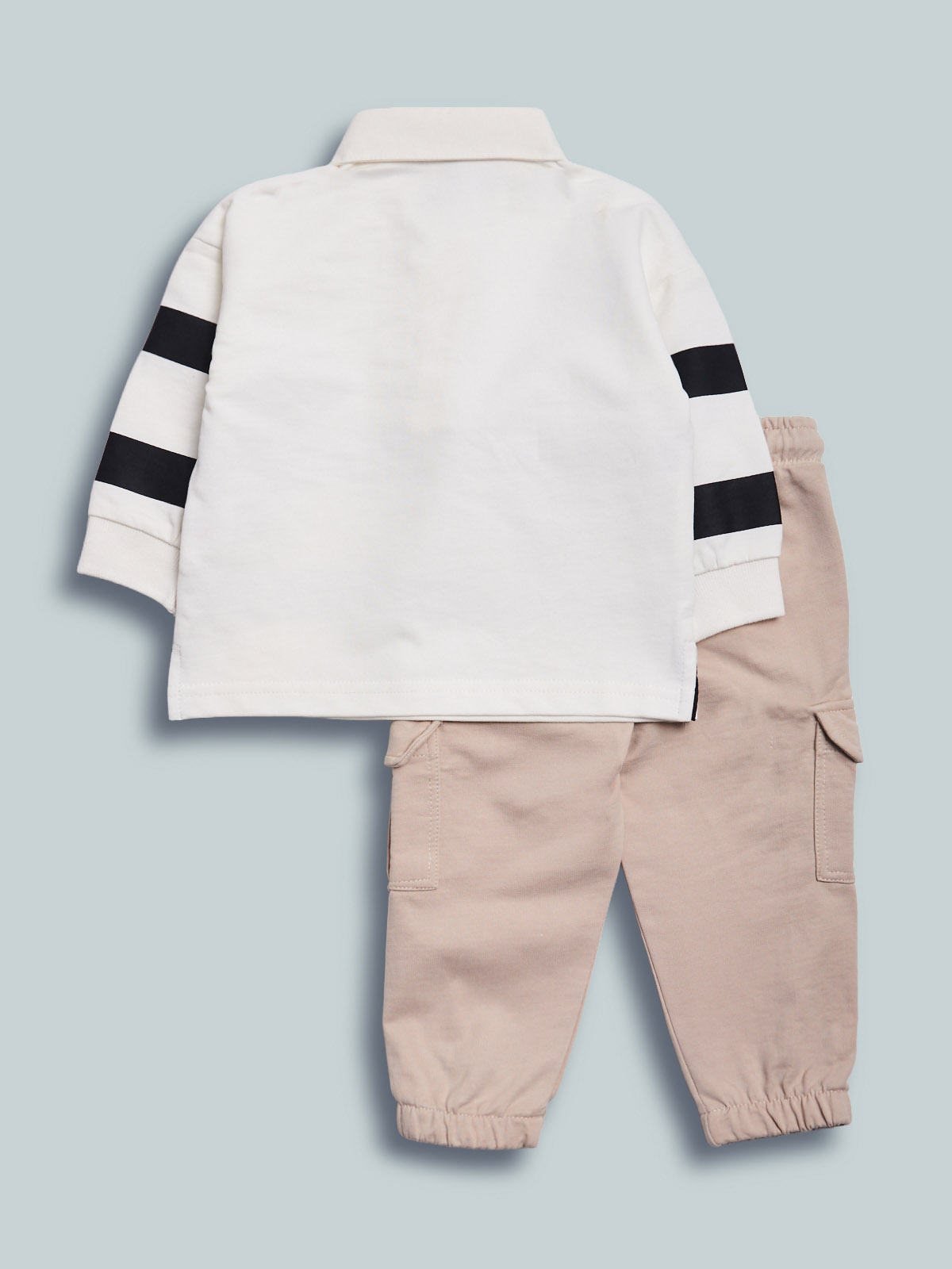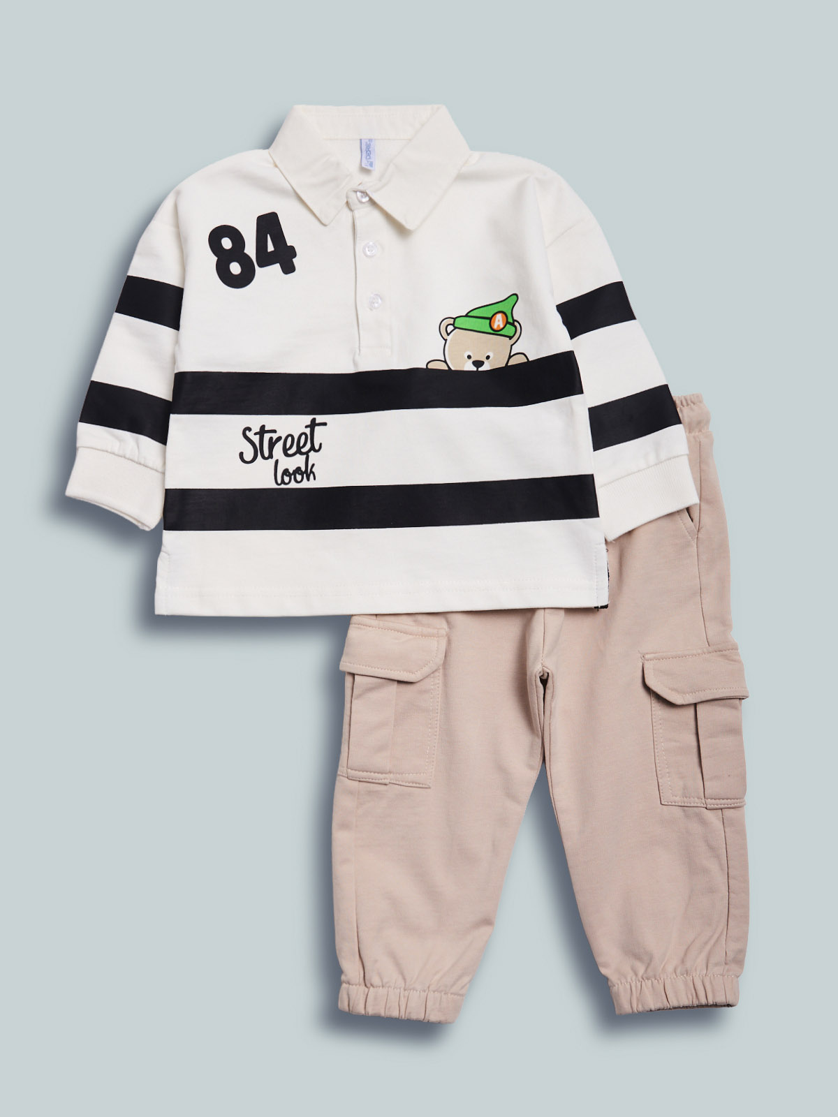 Completo due pezzi in morbida felpa leggera. Maglia a polo, aperta con bottoncini, polsi in costina, stampe su maniche e davanti. Pantaloni jogging con vita elasticata e coulisse regolabile, fondo gambe con elastico, tasche davanti e tasconi laterali stile cargo. Il capo ideale da indossare nel tempo libero.