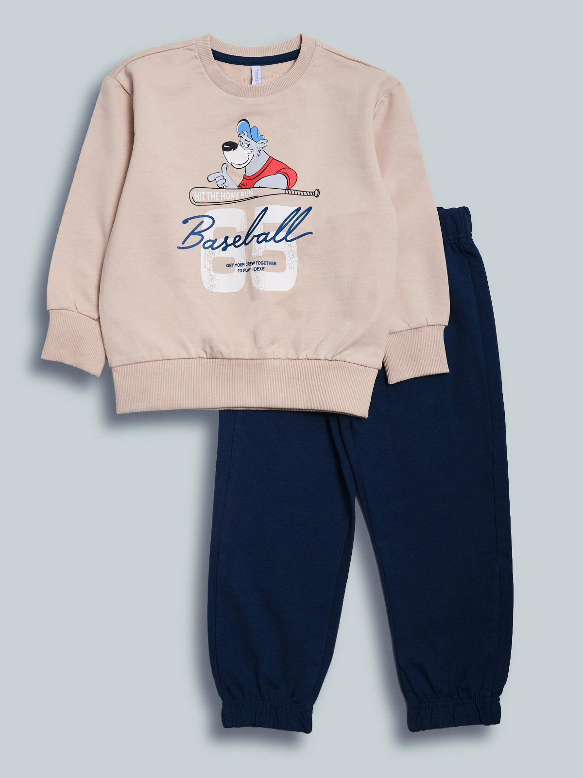 Completo due pezzi in morbida felpa leggera. Maglia girocollo con collo, polsi e fondo in costina e stampa sul davanti. Pantaloni con morbido elastico per vita e fondo gamba. Un capo pratico e comodo, ideale per lo sport e il tempo libero.