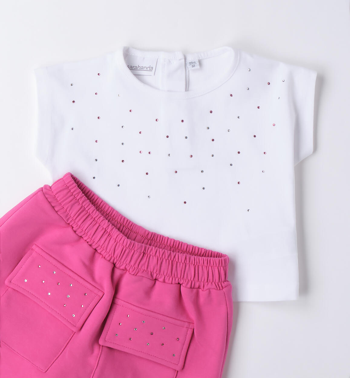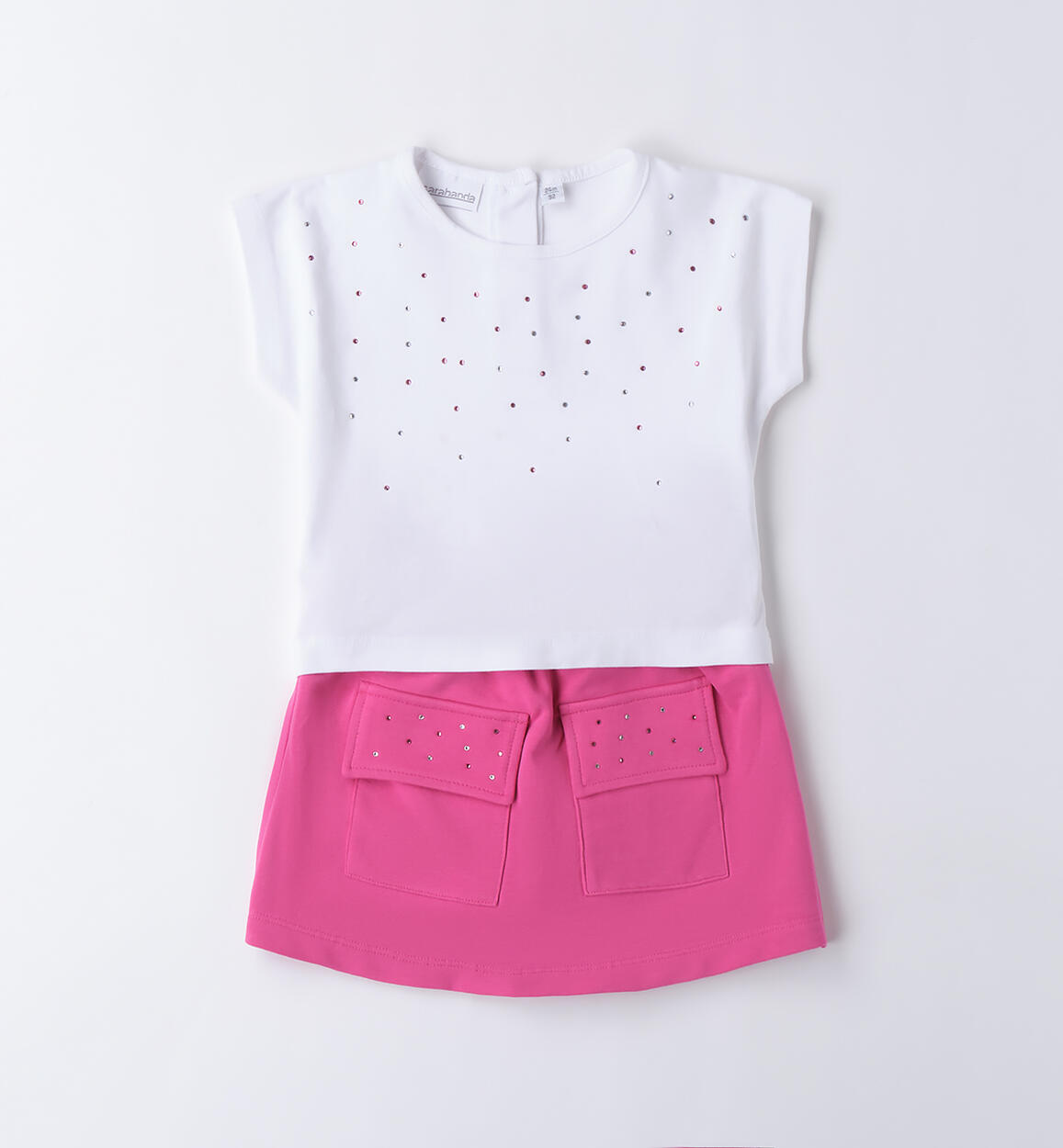 Grazioso completo Sarabanda per bambinaย realizzato in cotone stretch illuminato da colorati strass. La t-shirt รจ in jersey stertch e gli shorts fucsia sono in felpa con tasconi, effetto gonna