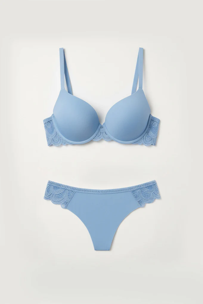Completo intimo brasiliano con reggiseno imbottito blu e ferretto