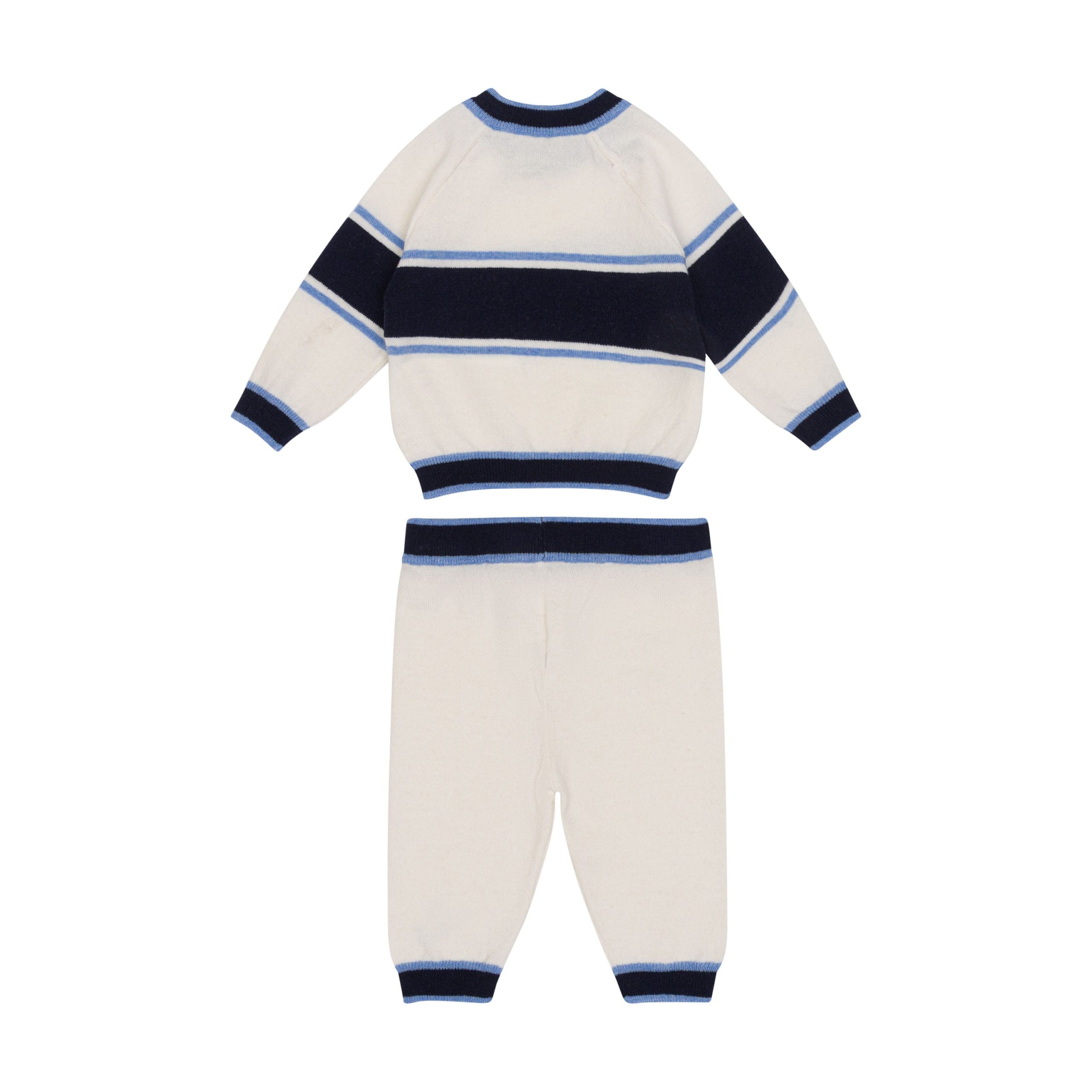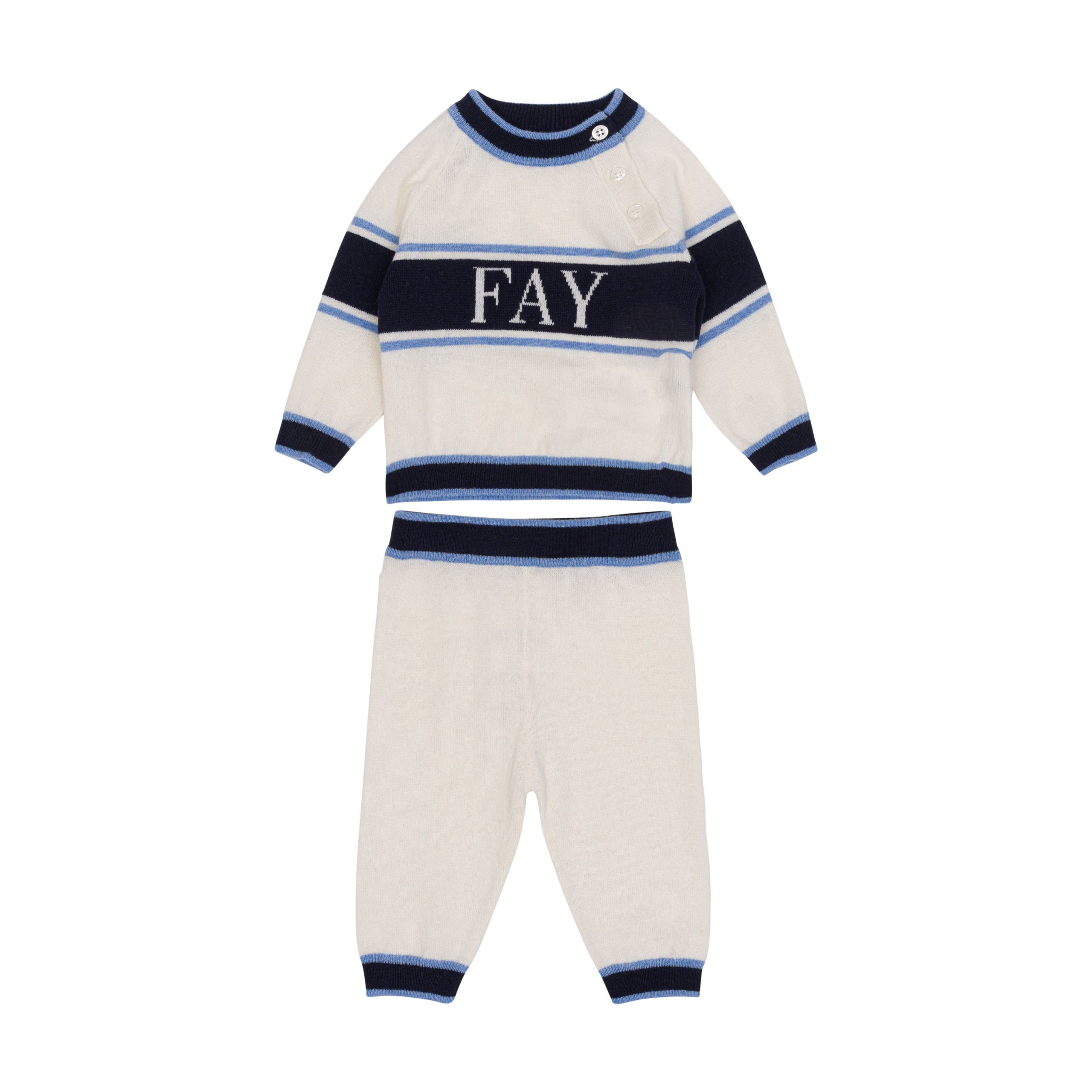 Completo sportivo in mista lana bianco/blu per neonato di Fay Kids. Dettagli: strisce bianche e blu, polsini a coste, logo ricamato centralmente, girocollo e chiusura con bottoni sulla spalla sinistra.
