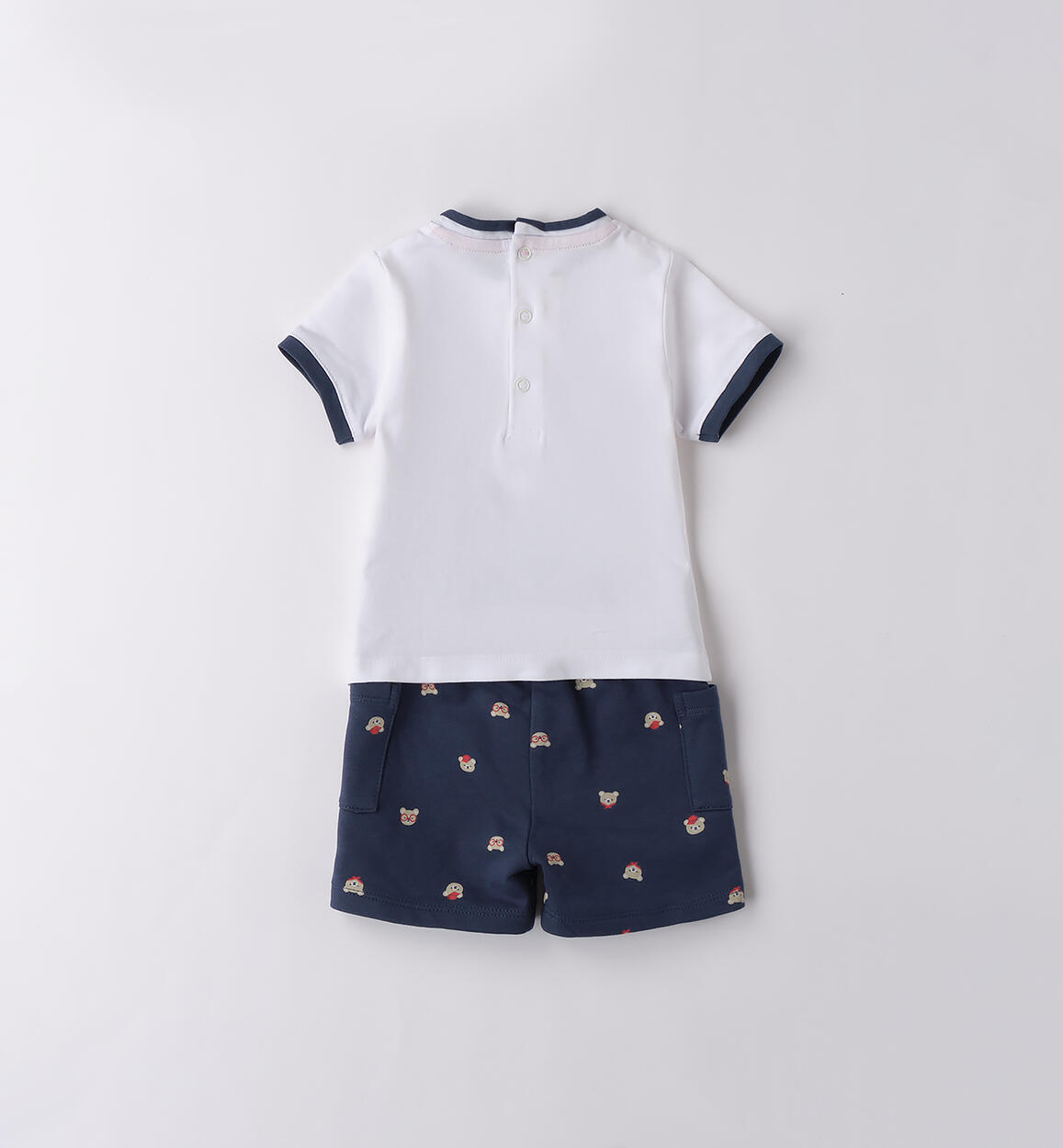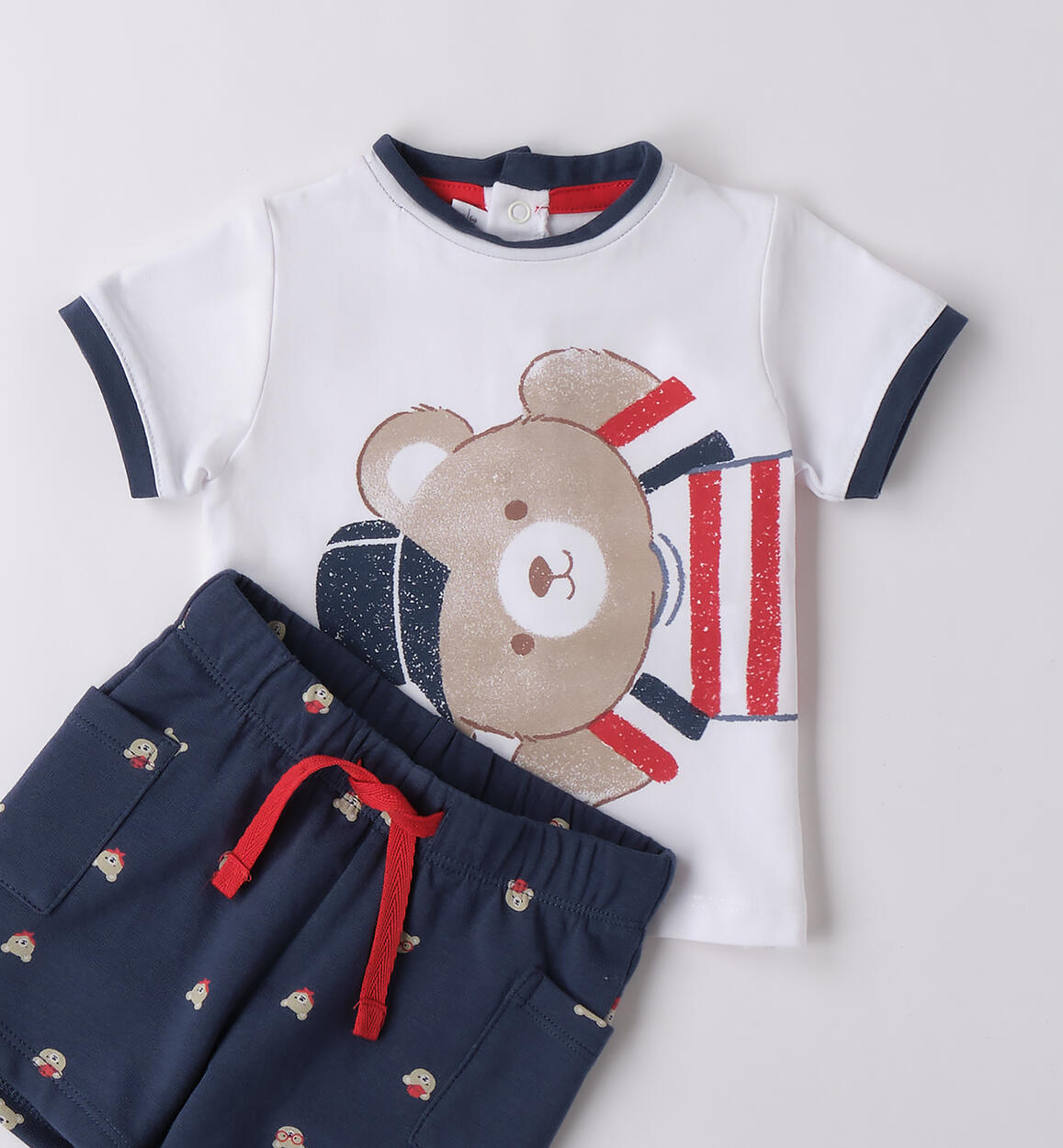 Completo Minibandaย realizzato in cotone stretch. La T-Shirt รจ in jersey e presenta apertura sul retro con bottoni a pressione per agevolare il cambio e la vestizione, fantasia tinta unita con colletto e maniche a contrasto. Stampa dolce orso. I pantaloni sono in felpa, hanno vita elasticizzata con coulisse, tasche laterali e fantasia allover