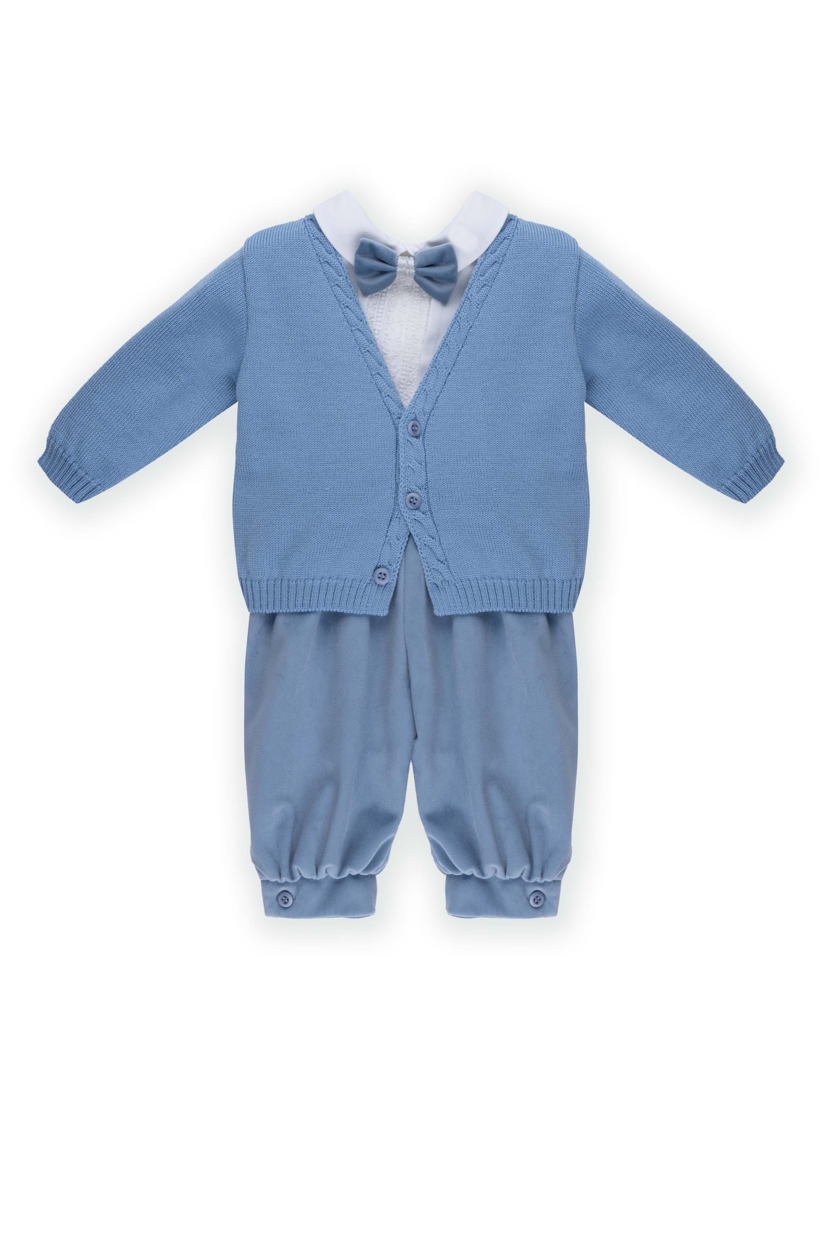 Completo elegante in velluto e lana nei toni del celeste polvere composto da camicia in cotone, ricamo sul davanti in pizzo e bottoni funzionali sul retro, cardigan in pura lana scollo a v a treccia, pantalone salopette modello ballon in velluto e raso foderato in cotone completo di papillon in velluto.