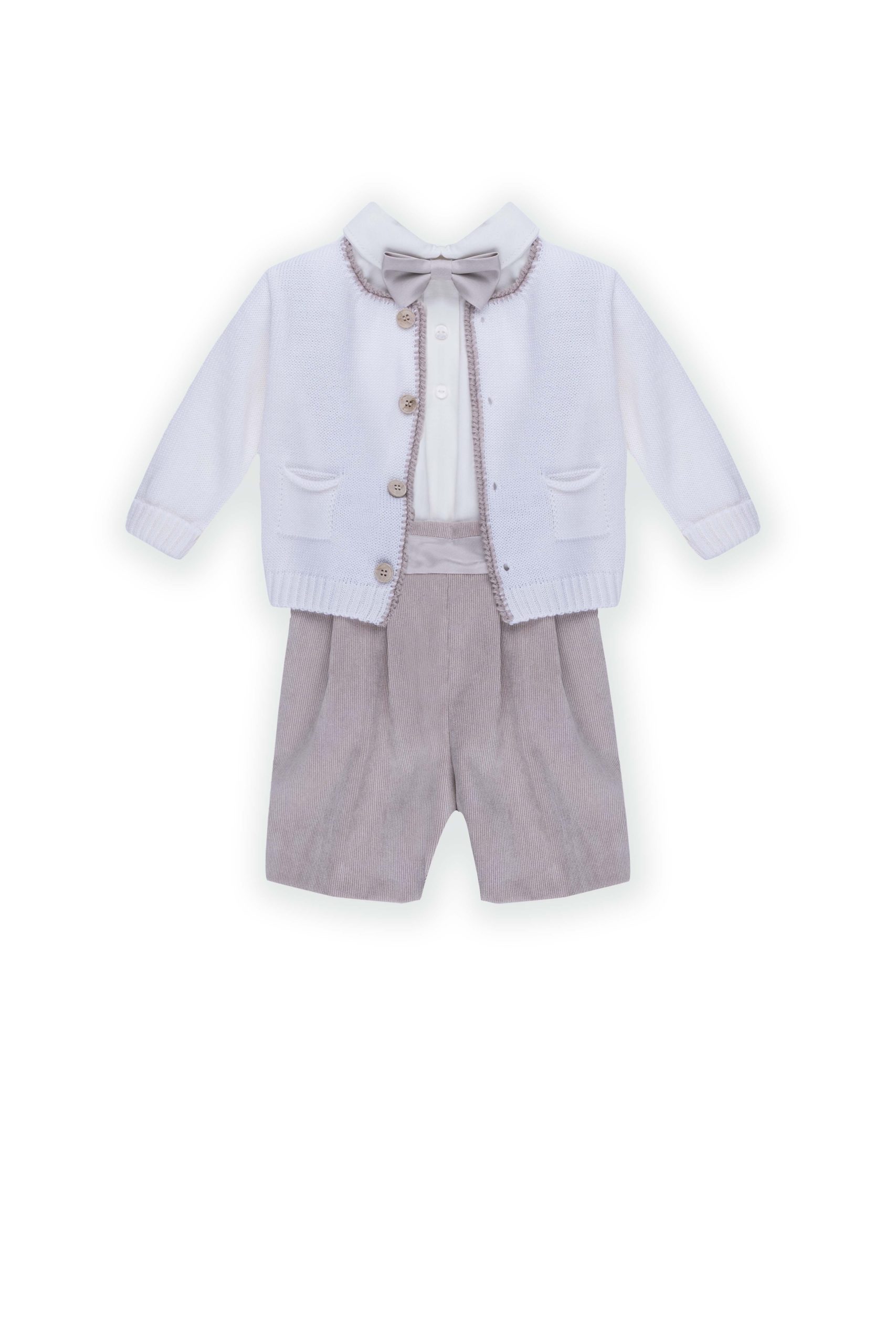 Completo elegante per neonati in velluto liscio, completo di cardigan in pura lana con orlo ricamato a mano in contrasto di colore, Camicia a body in jersey con bottoni sul davanti, Bermuda con pence in velluto liscio con bretelle e cintura in raso abbinato con pappillon in raso.