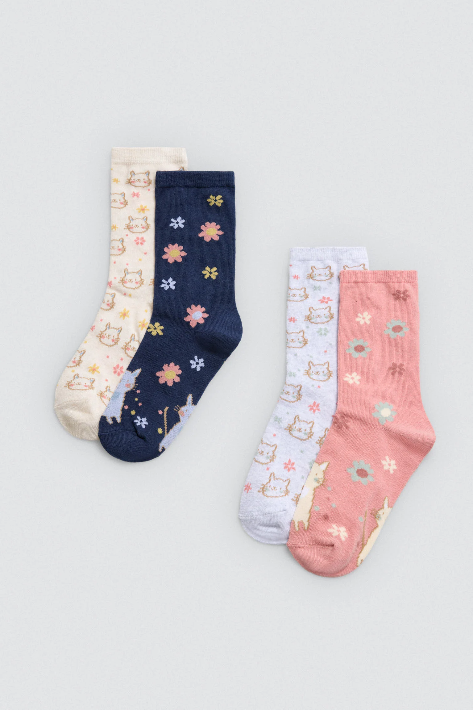 Confezione da 4 paia di calzini per bambina con polsini anti-pressione e stampa di gatti e fiori.