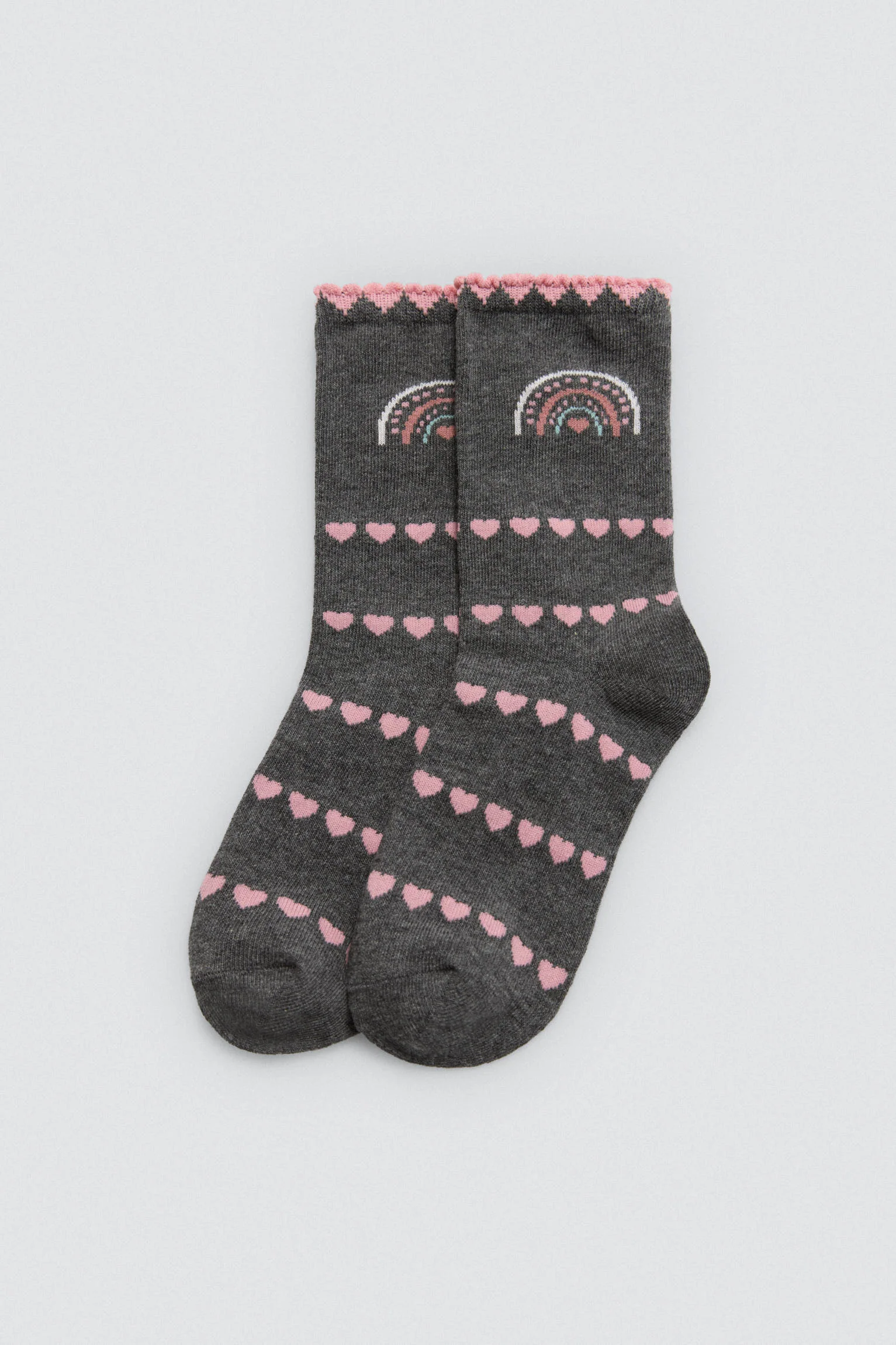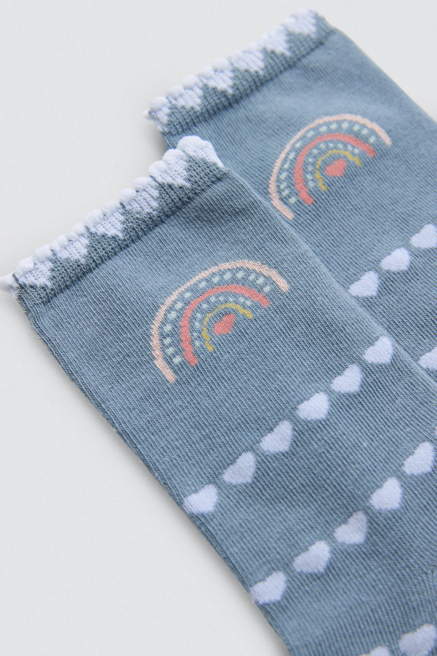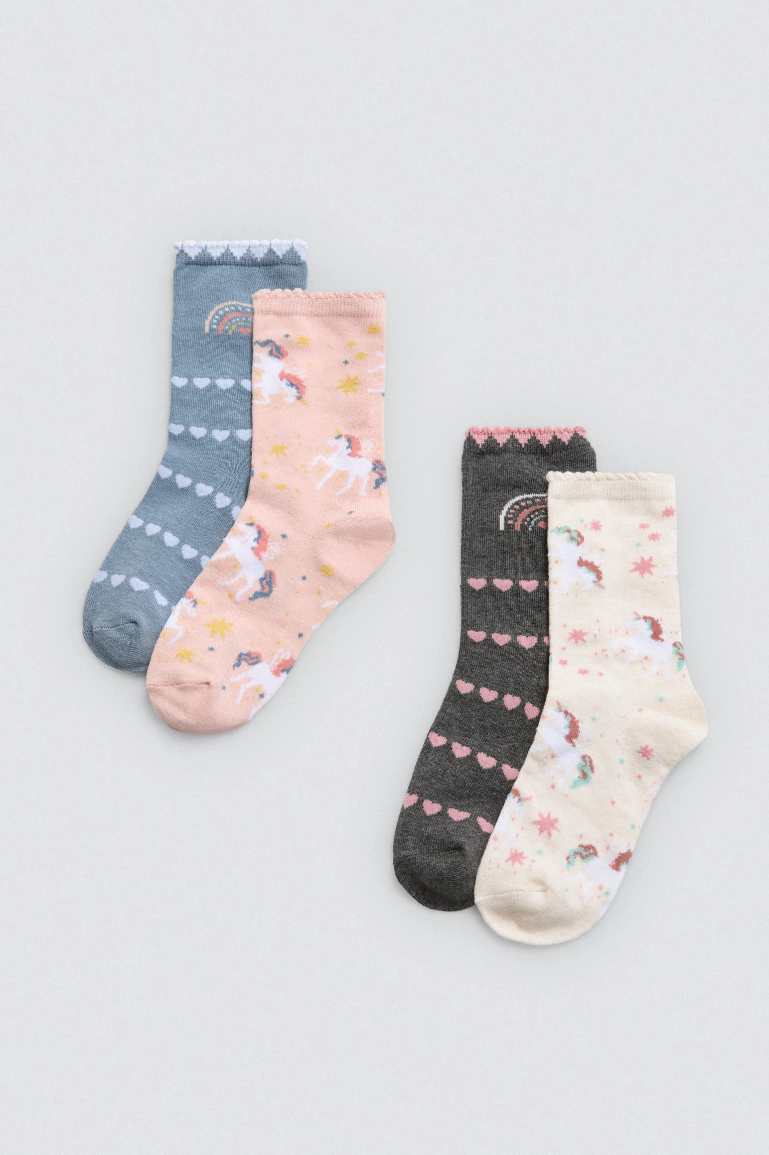 Confezione da 4 paia di calzini da bambina con polsini anti-pressione. Questo modello presenta una stampa con unicorno e cuore.