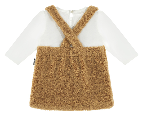 Gonna a salopette Moschino in tessuto teddy con maxy ordo anteriore e t-shirt in calso cotone panna a manica lunga.