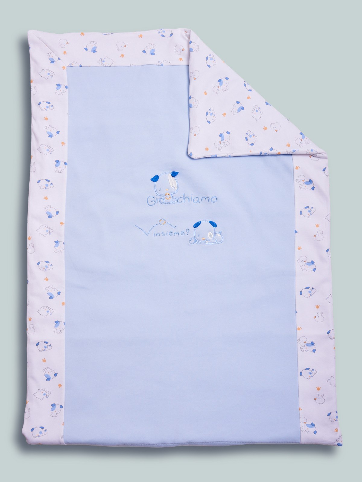Calda copertina con la quale il tuo piccolo/a si sentirร protetto durante i suoi riposini. Tessuto caldo cotone fantasia e unito. Elemento decorativo: grafica ricamata riproposto su altri articoli della collezione. Particolaritร dell’ articolo: sacco imbottito estraibile. Dimensioni dell’articolo: 82 x 60cm. Questo accessorio fa parte del corredino composto da tutti gli articoli indispensabili per il tuo neonato.