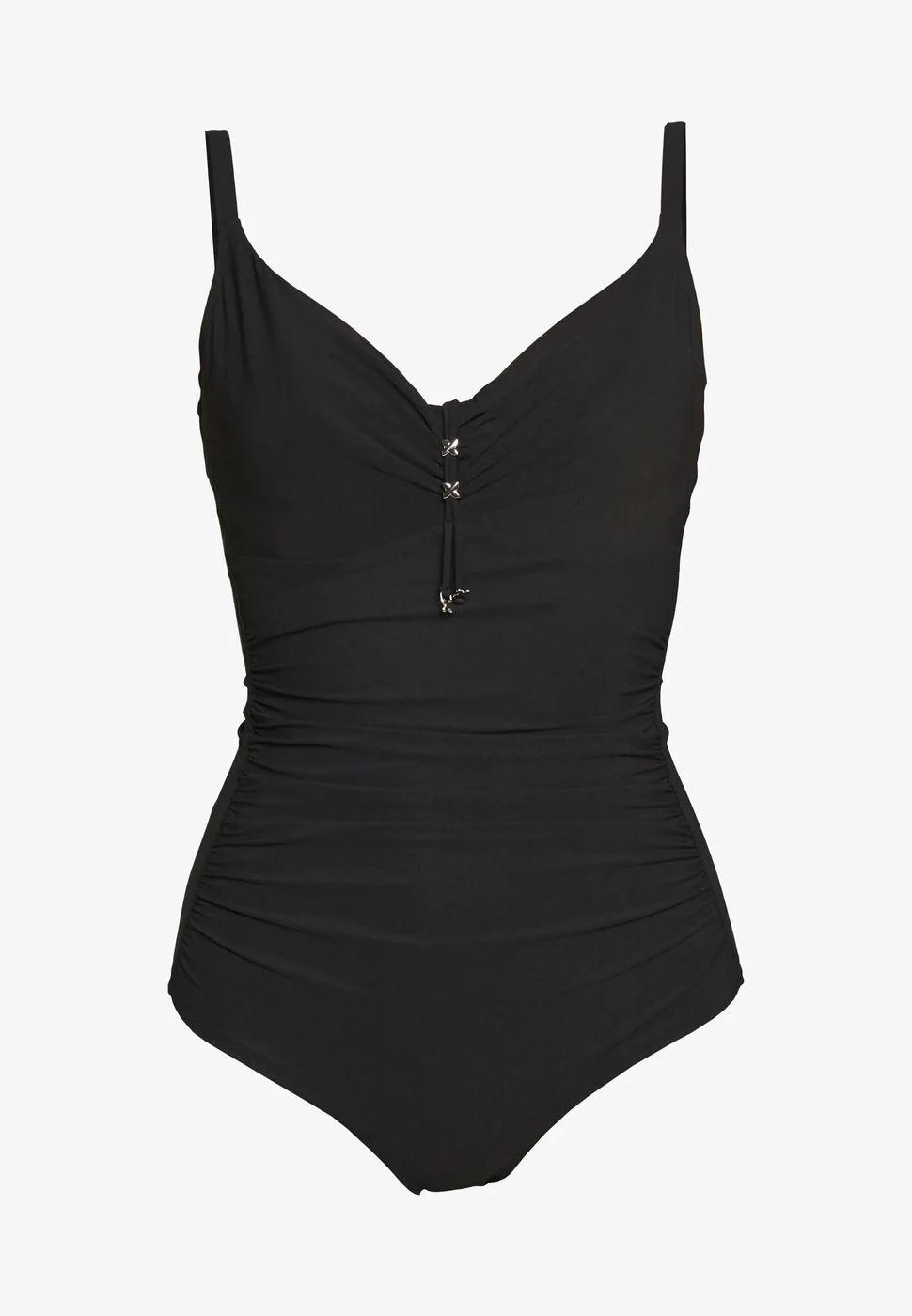 Costume intero total black vuoto con ferretto. Applicazioni metalliche sul seno. Coppa D. 71% poliammide 29% elastan