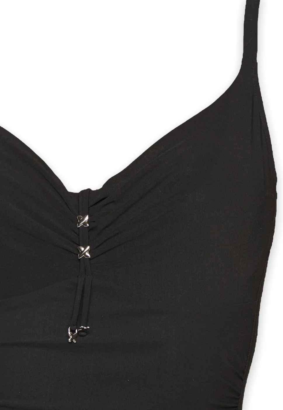 Costume intero total black vuoto con ferretto. Applicazioni metalliche sul seno.